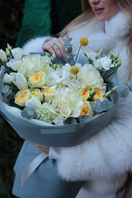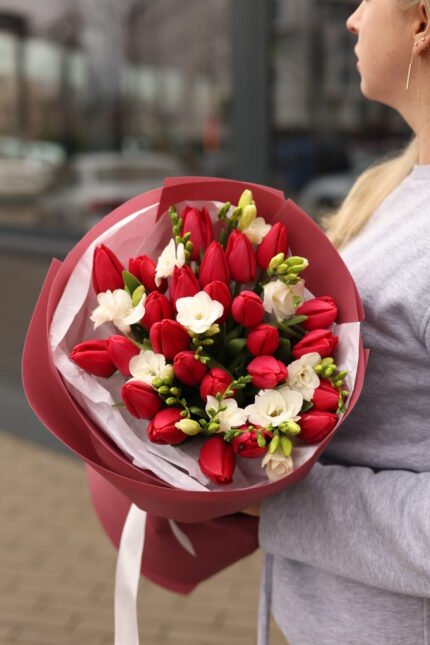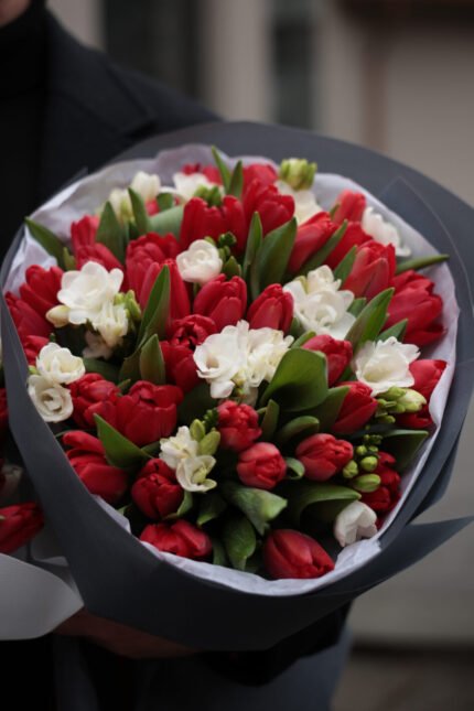 Поєднання ранункулюсів, тюльпанів та еустоми