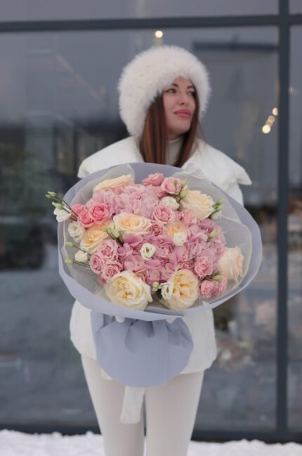 Мікс рожевих гортензій та піоновидних троянд Лорена