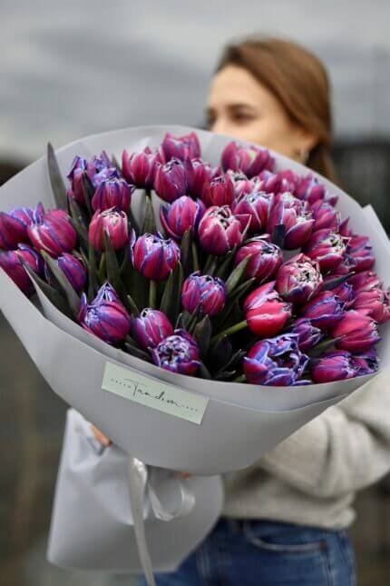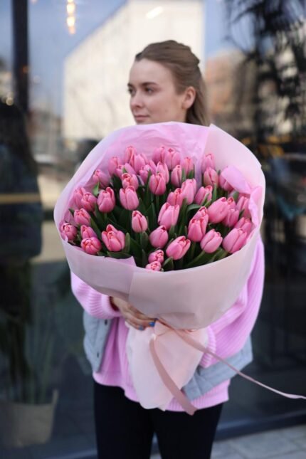 Весняний букет з тюльпанів, еустоми та гвоздик