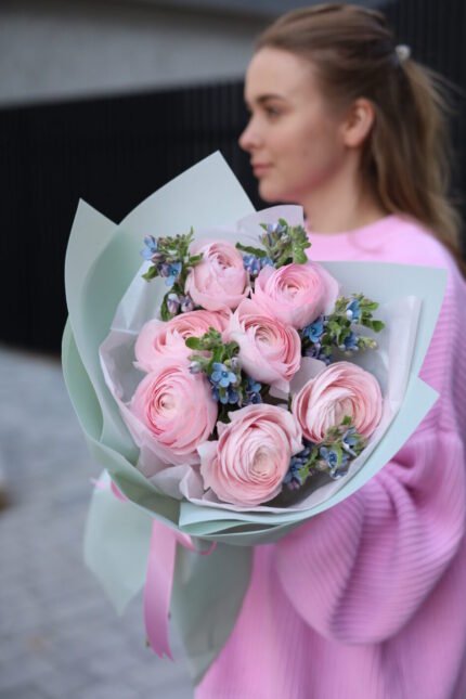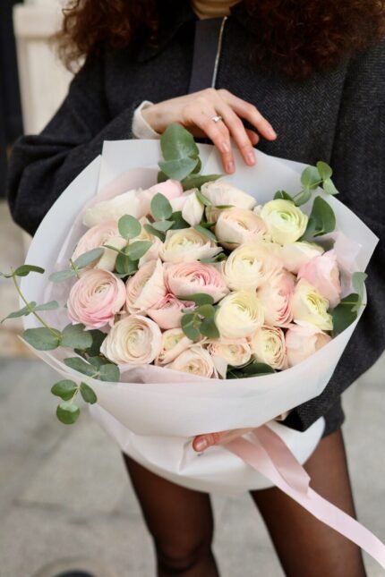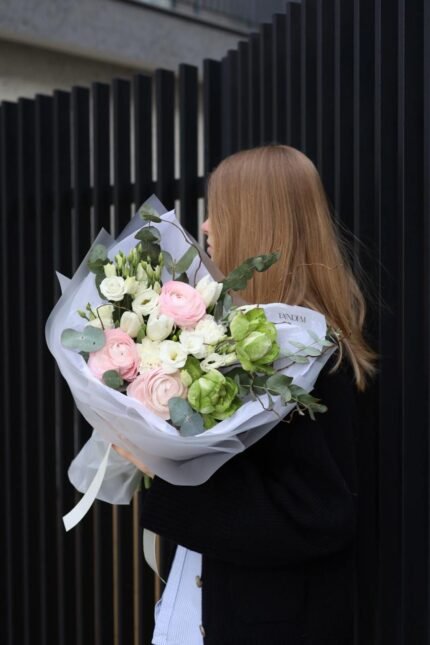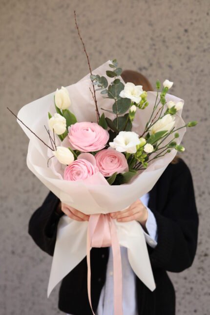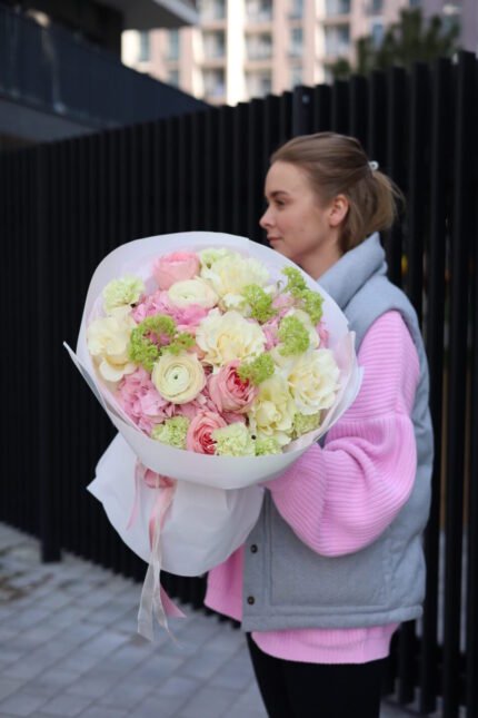 Ніжний мікс із ранункулюсом, діантусом та тюльпанами