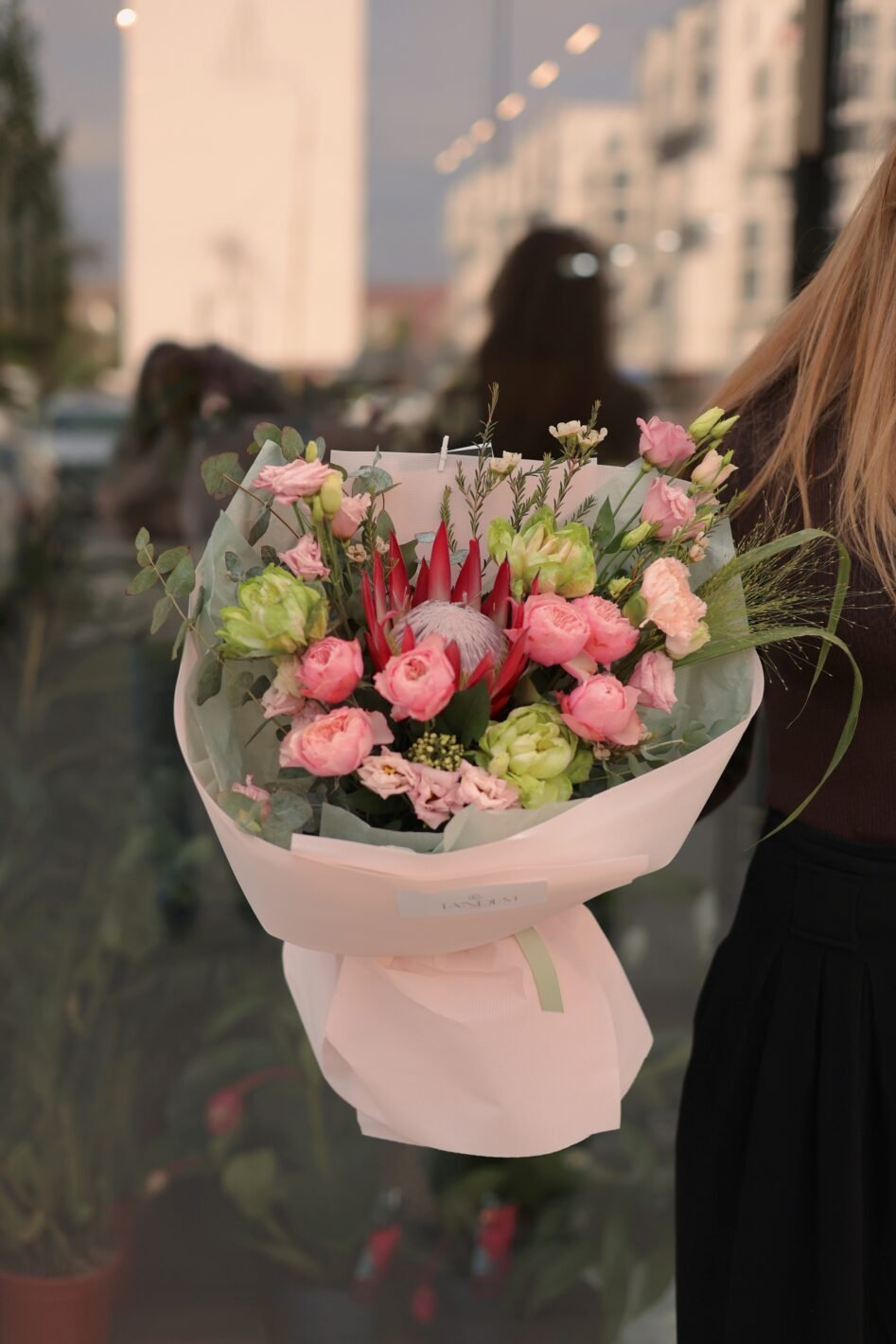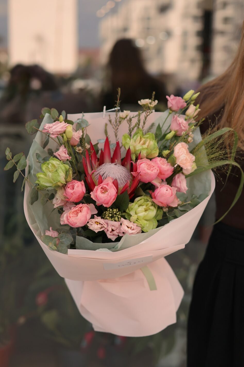 Букет з протеєю, веггі та пілновидними трояндами