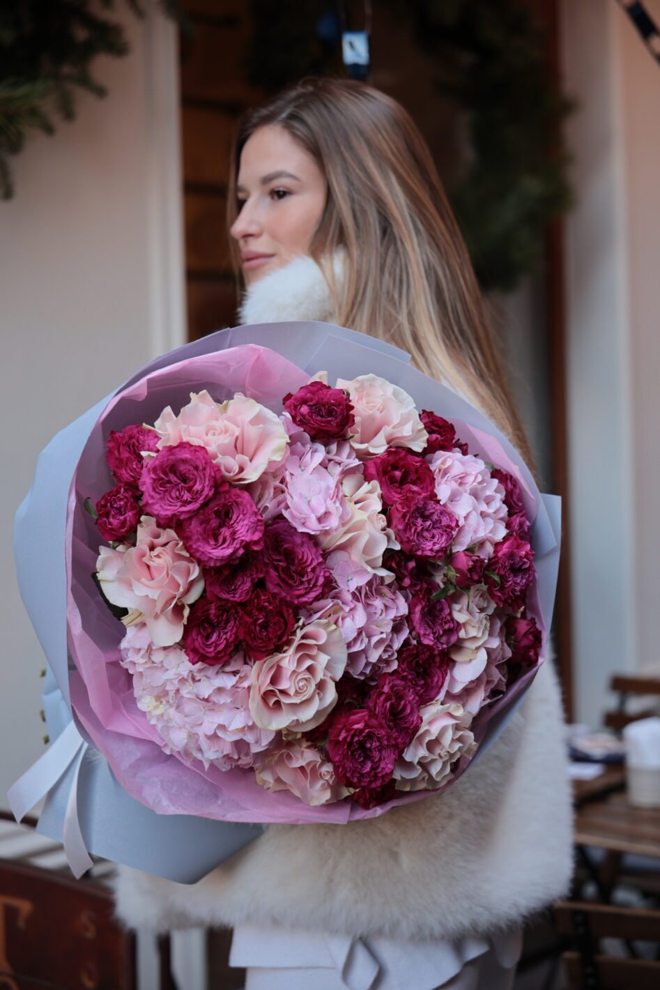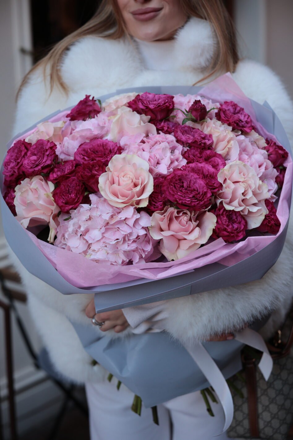 Бордово-рожевий букет з гортензіями та піоновидними трояндами