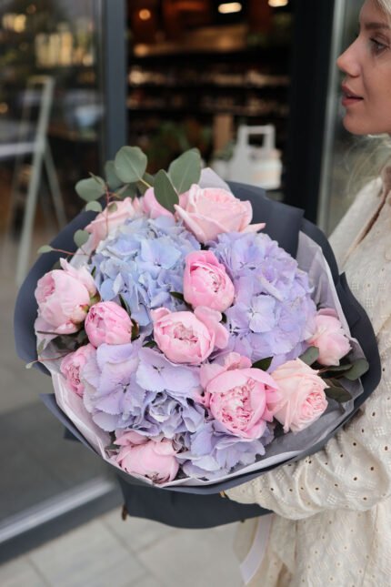 Bouquet with blue and pink hydrangeas and eustoma