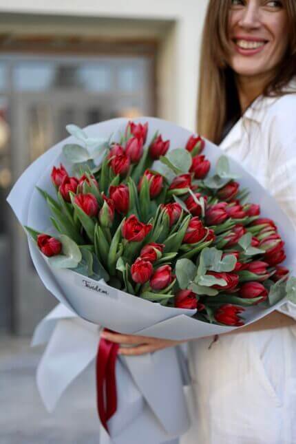 Bouquet of 51 tulips and eucalyptus