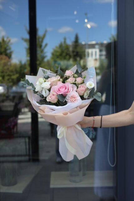Bouquet of Pink Athena roses, eustoma and bush roses