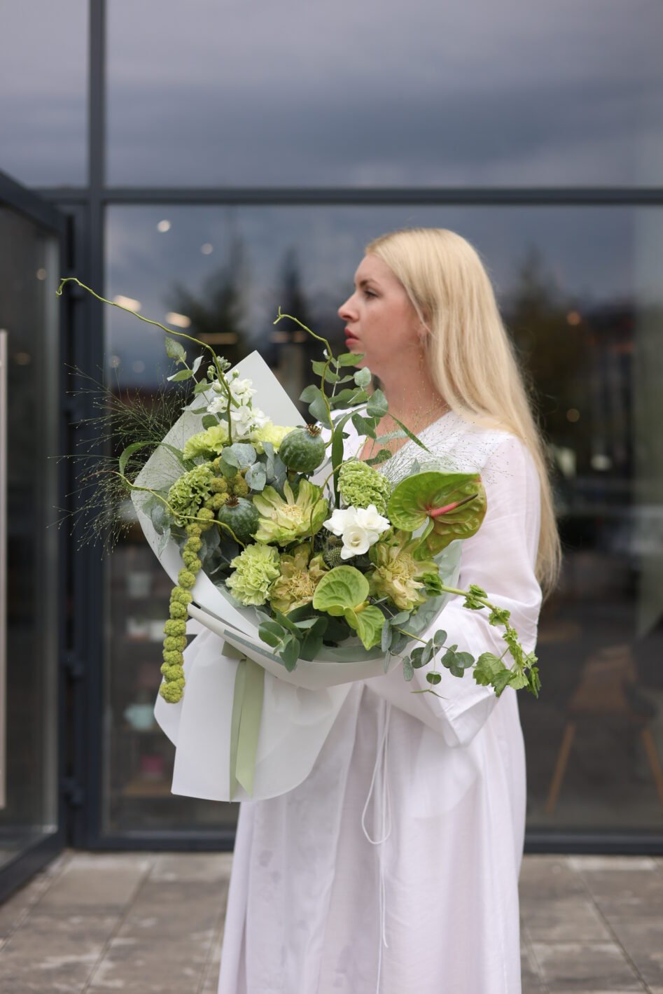 Зелений букет з антуріумом та амарантом