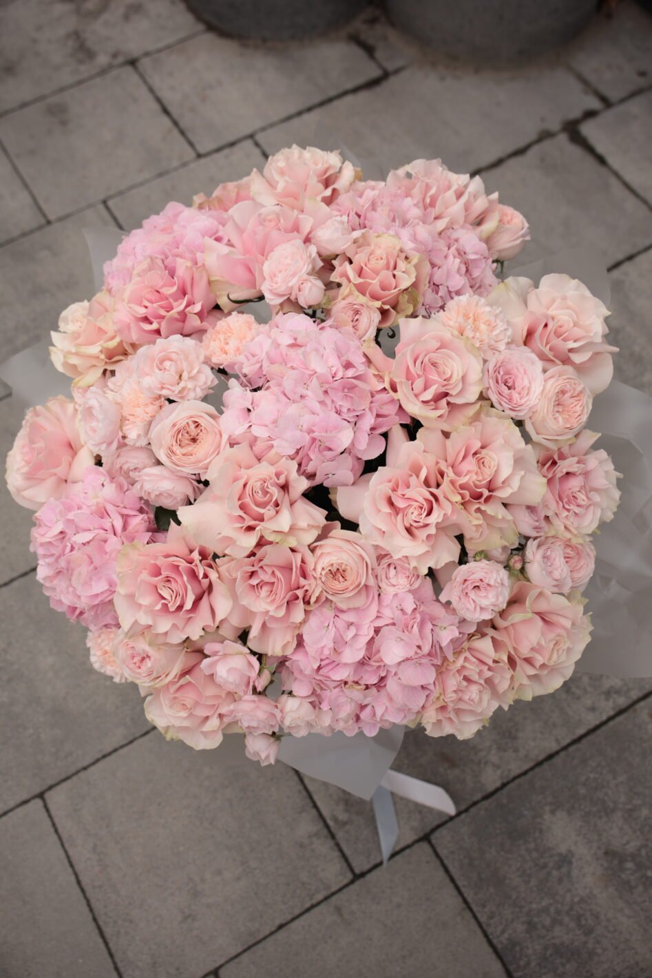 Квітковий кошик в рожевих кольорах з гортензією та трояндами