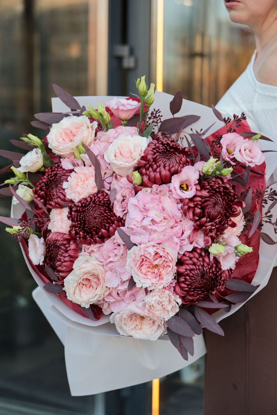 Мікс із гортензій, піоновидних троянд та хризантеми