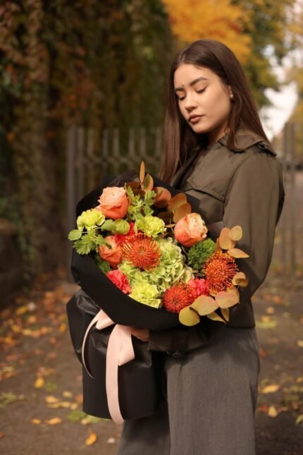 Соковитий осінній мікс із зеленою гортензією та трояндами кахала