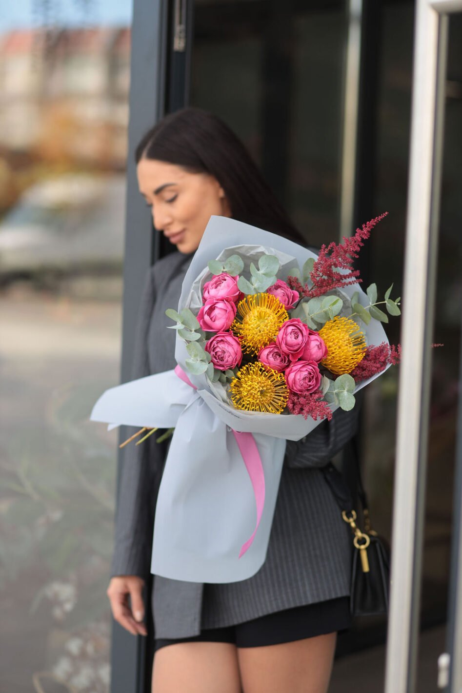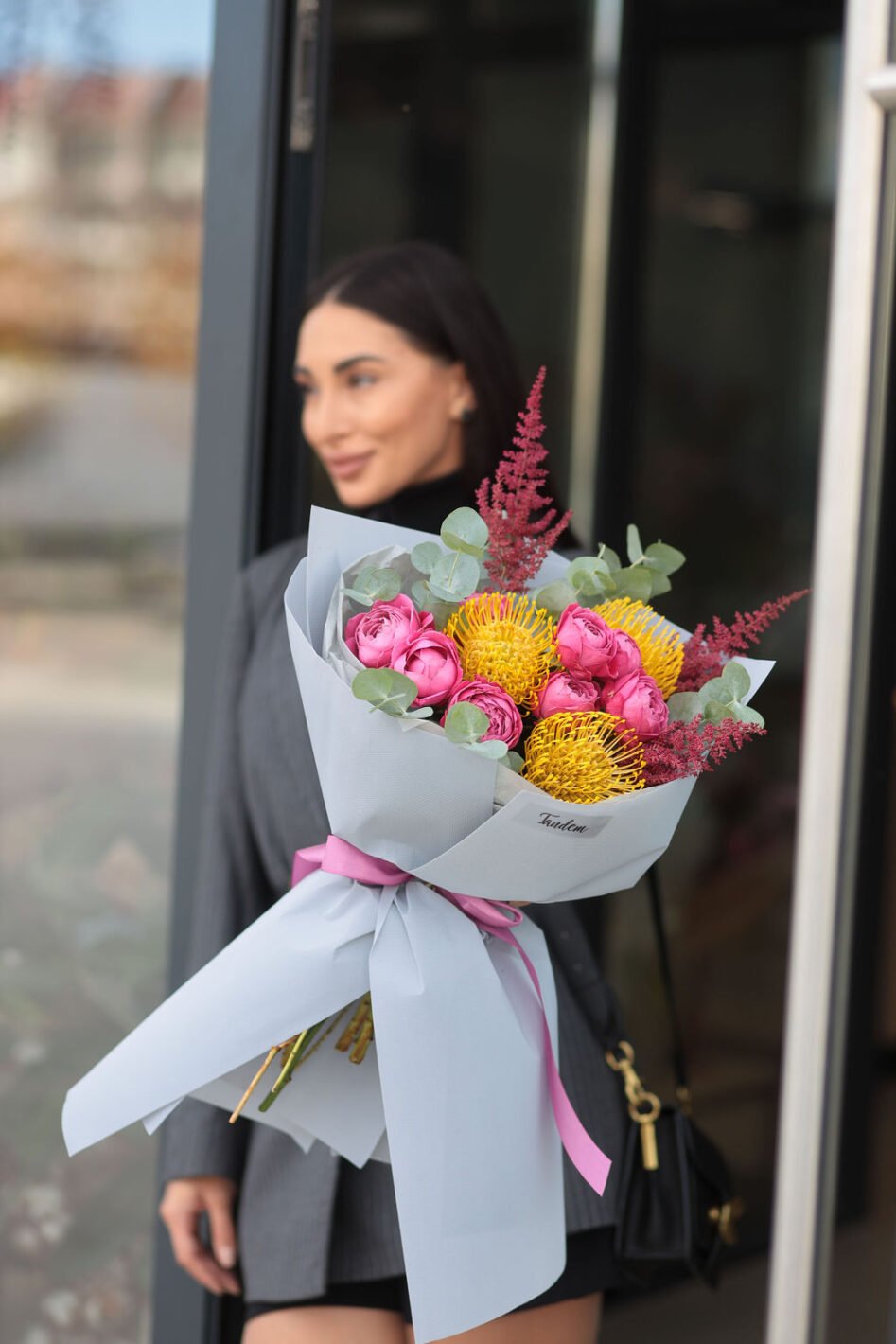 Яскравий букет з нутаном та піоновидними трояндами