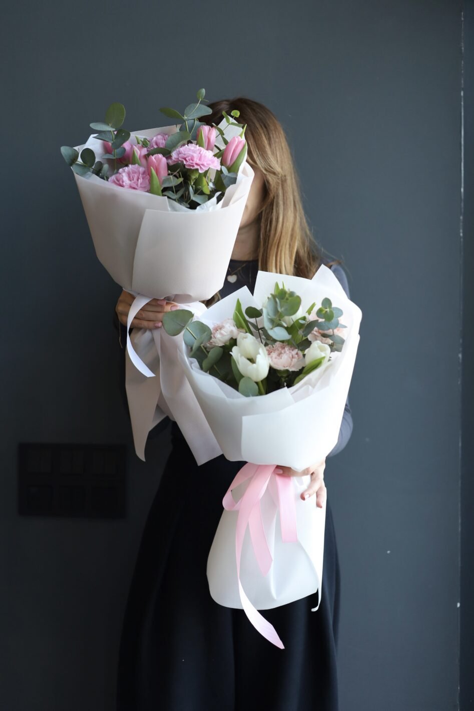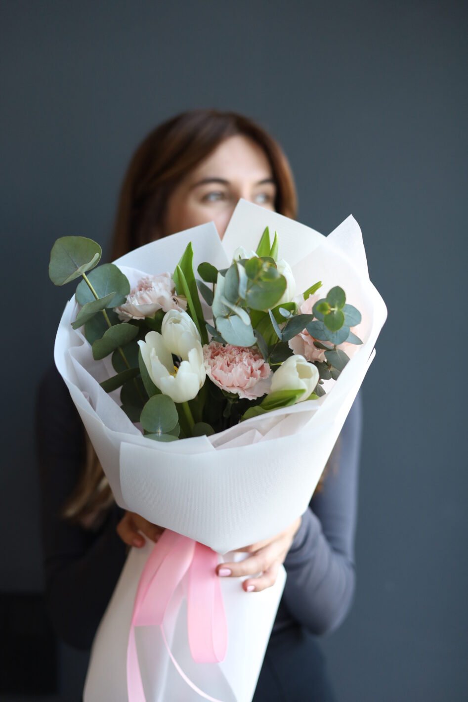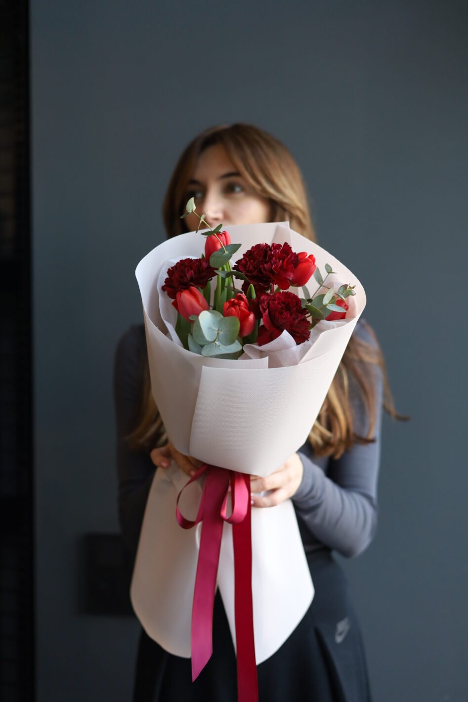 Кольори тюльпанів та діантусу рандомні. Якщо є конкретні побажання, можна вказати в коментарях при замовленні уточнення