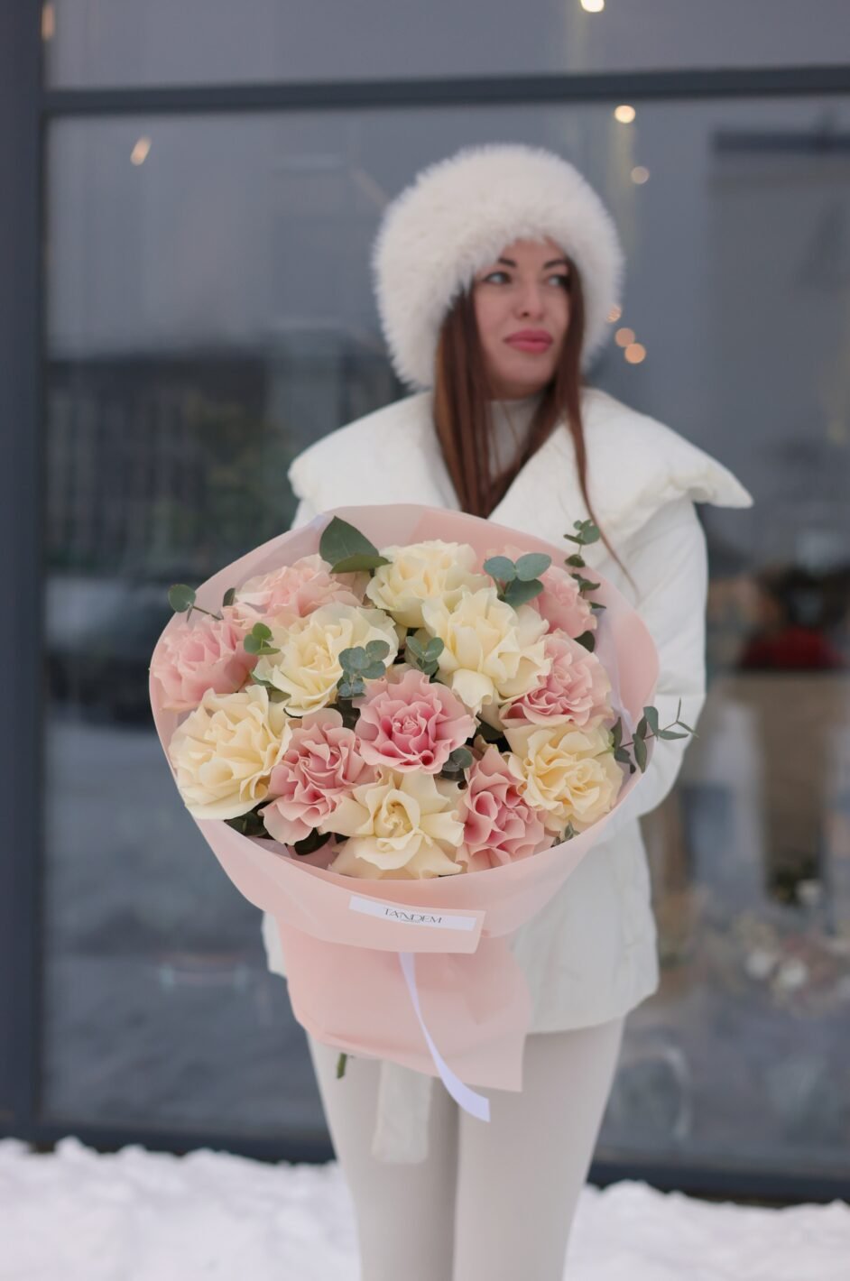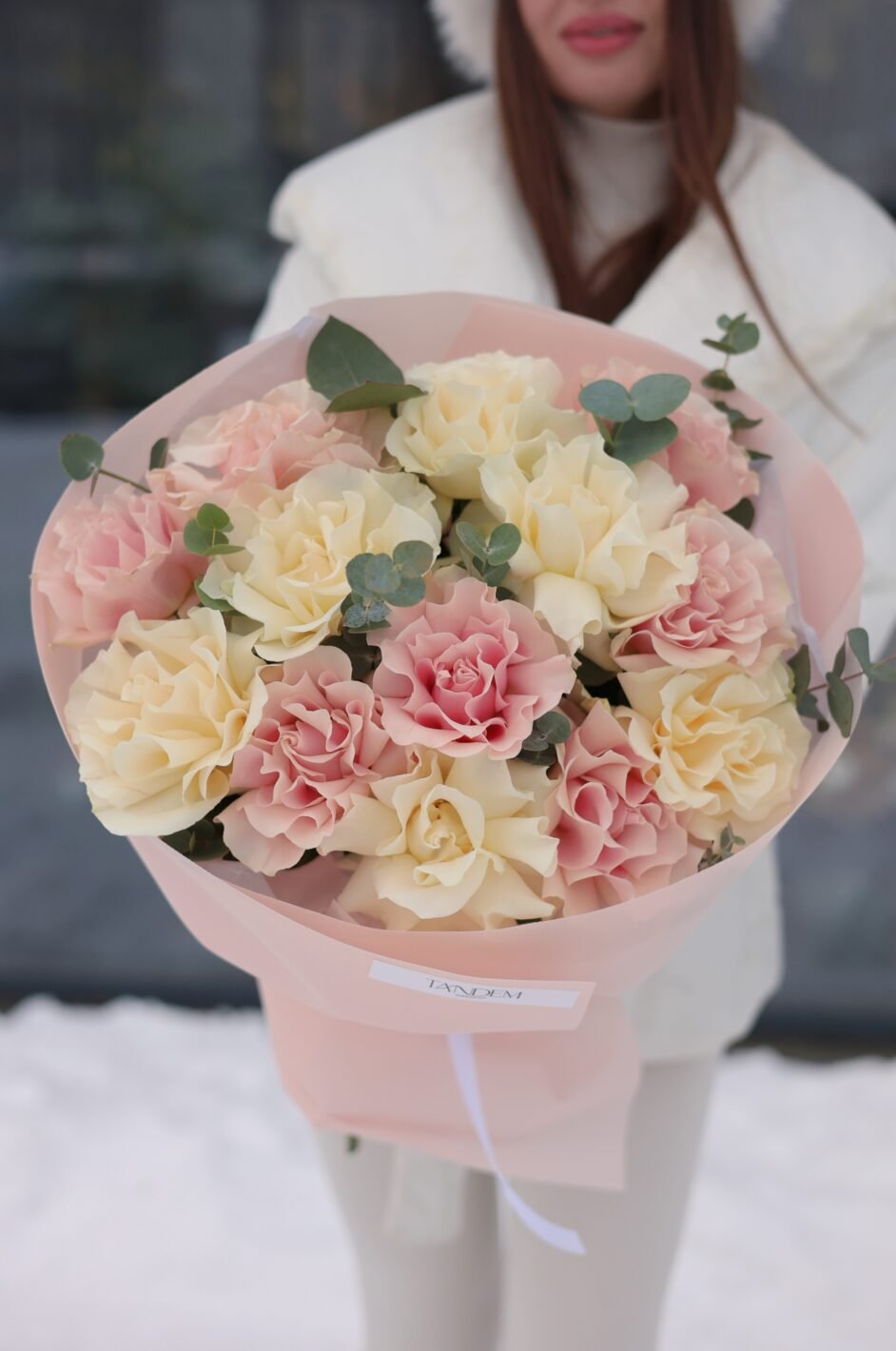 біло-рожевий букет мереживних троянд