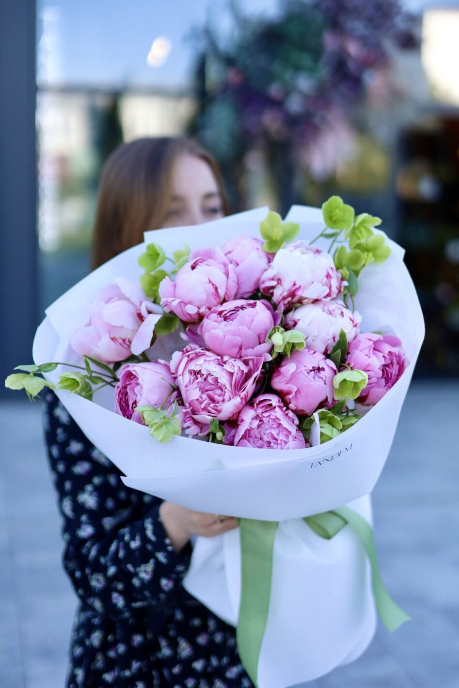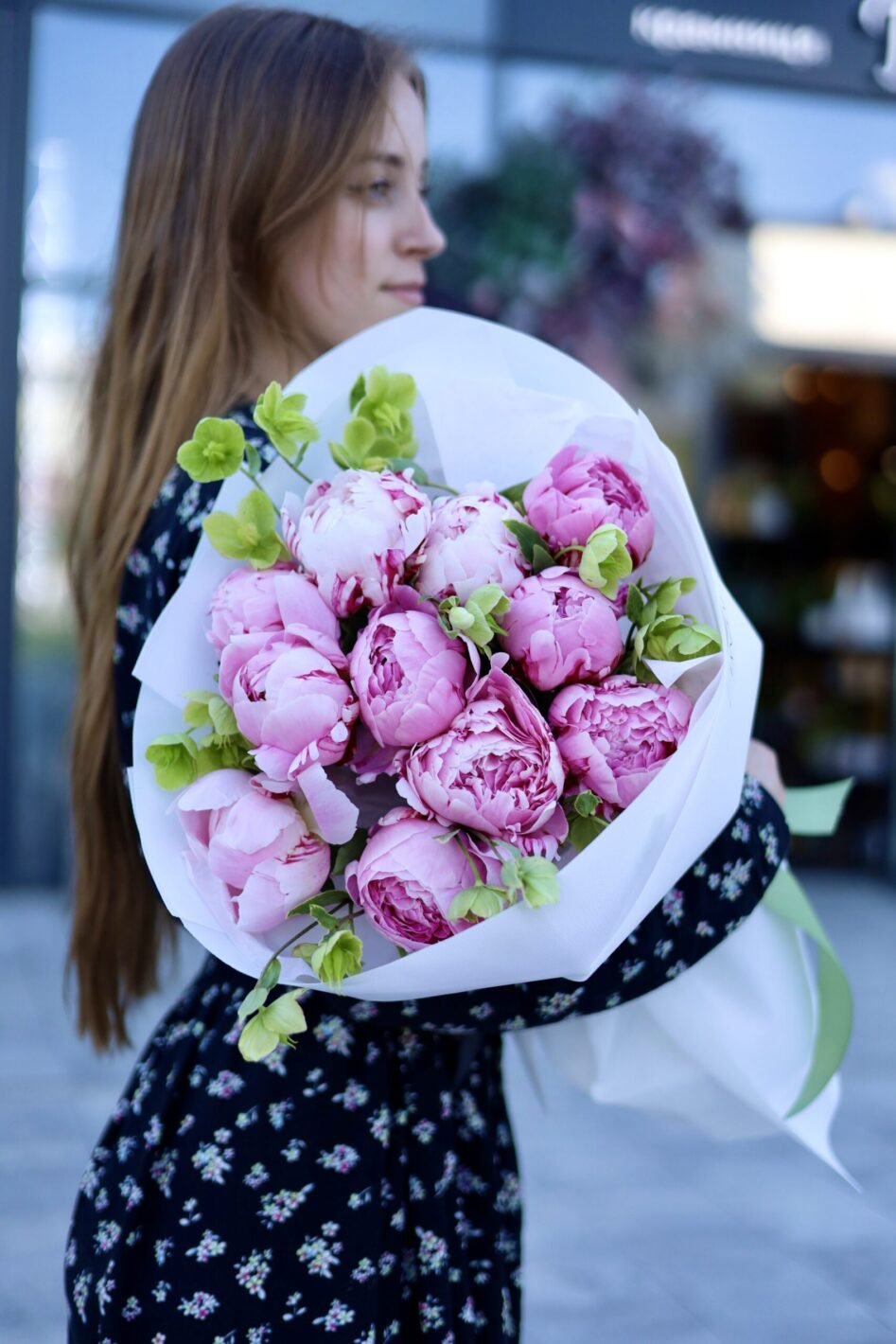 Букет із 11 піонів Сара Бернард та хелеборуса
