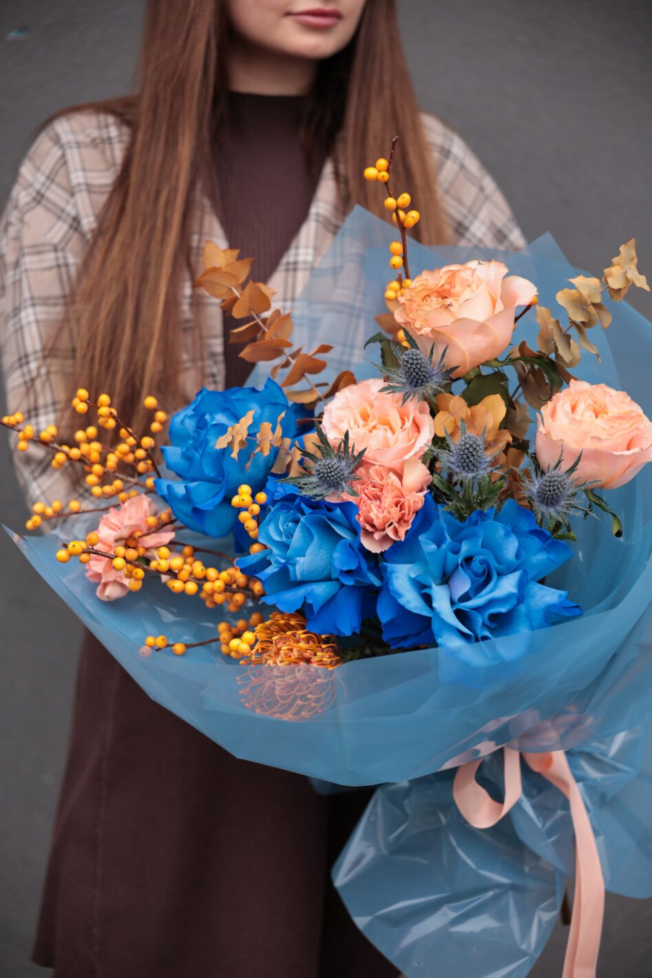 Букет із синіми трояндами та оранжевим ілексом