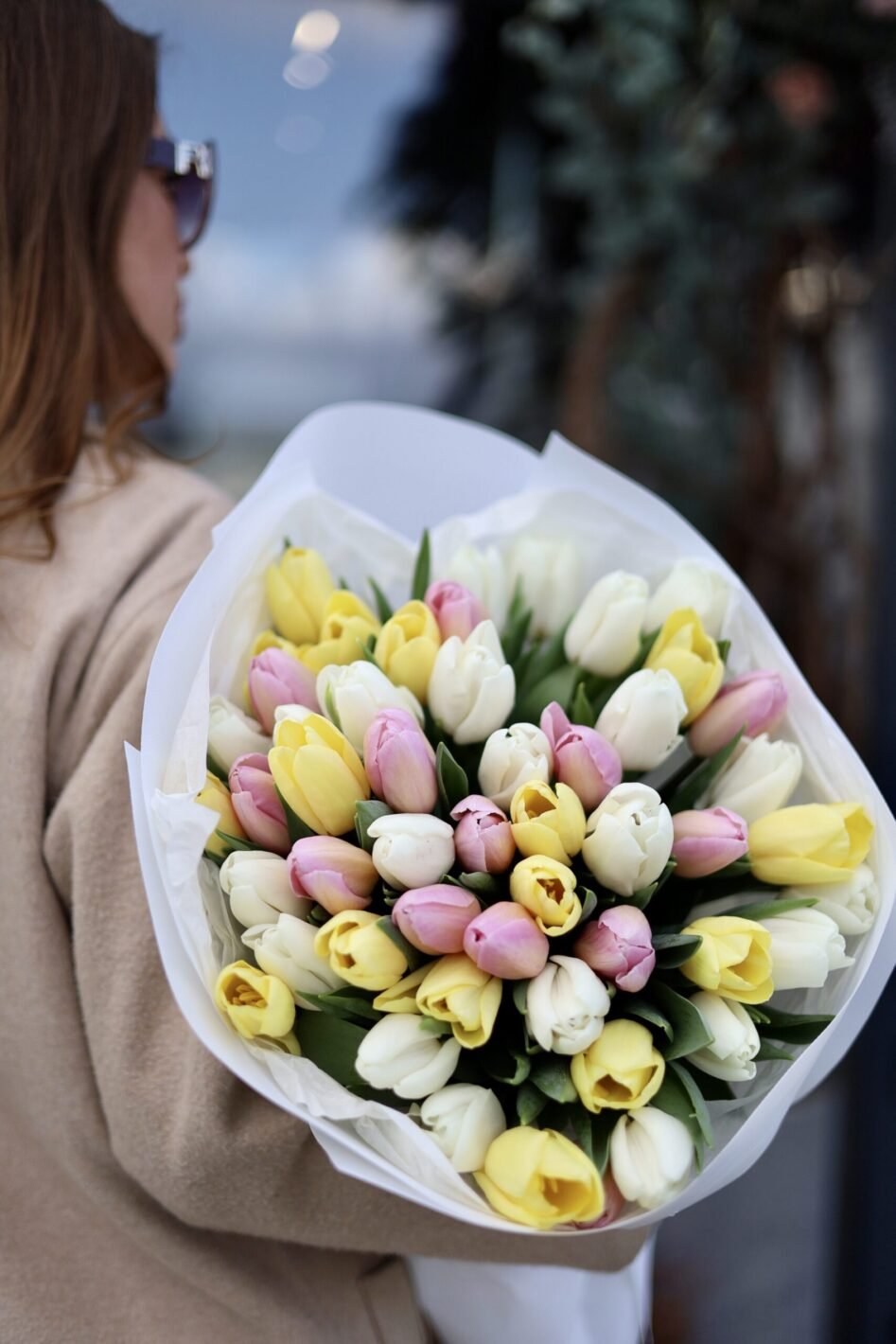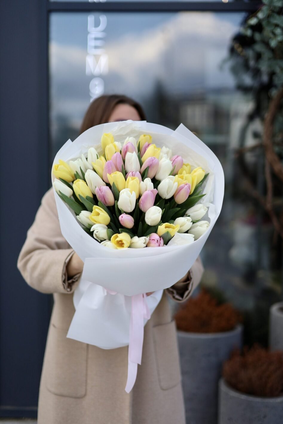 букет з 51 біло-рожево-жовтого тюльпану