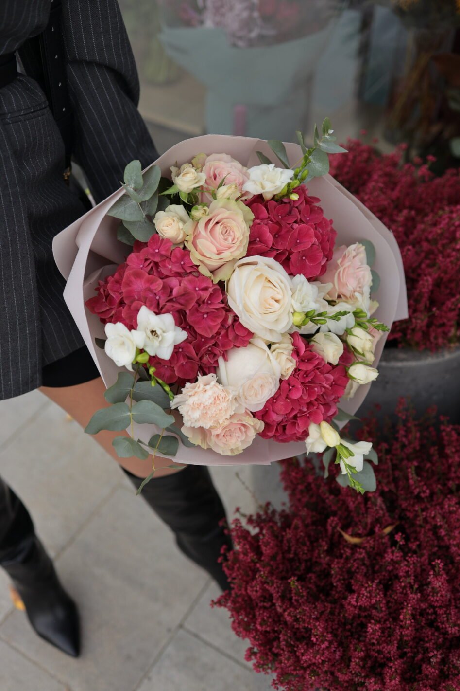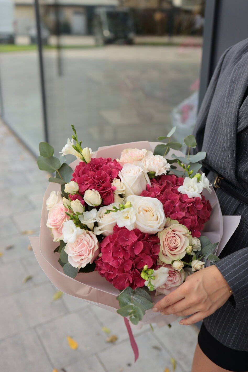 Букет з бордовими гортензіями та трояндами