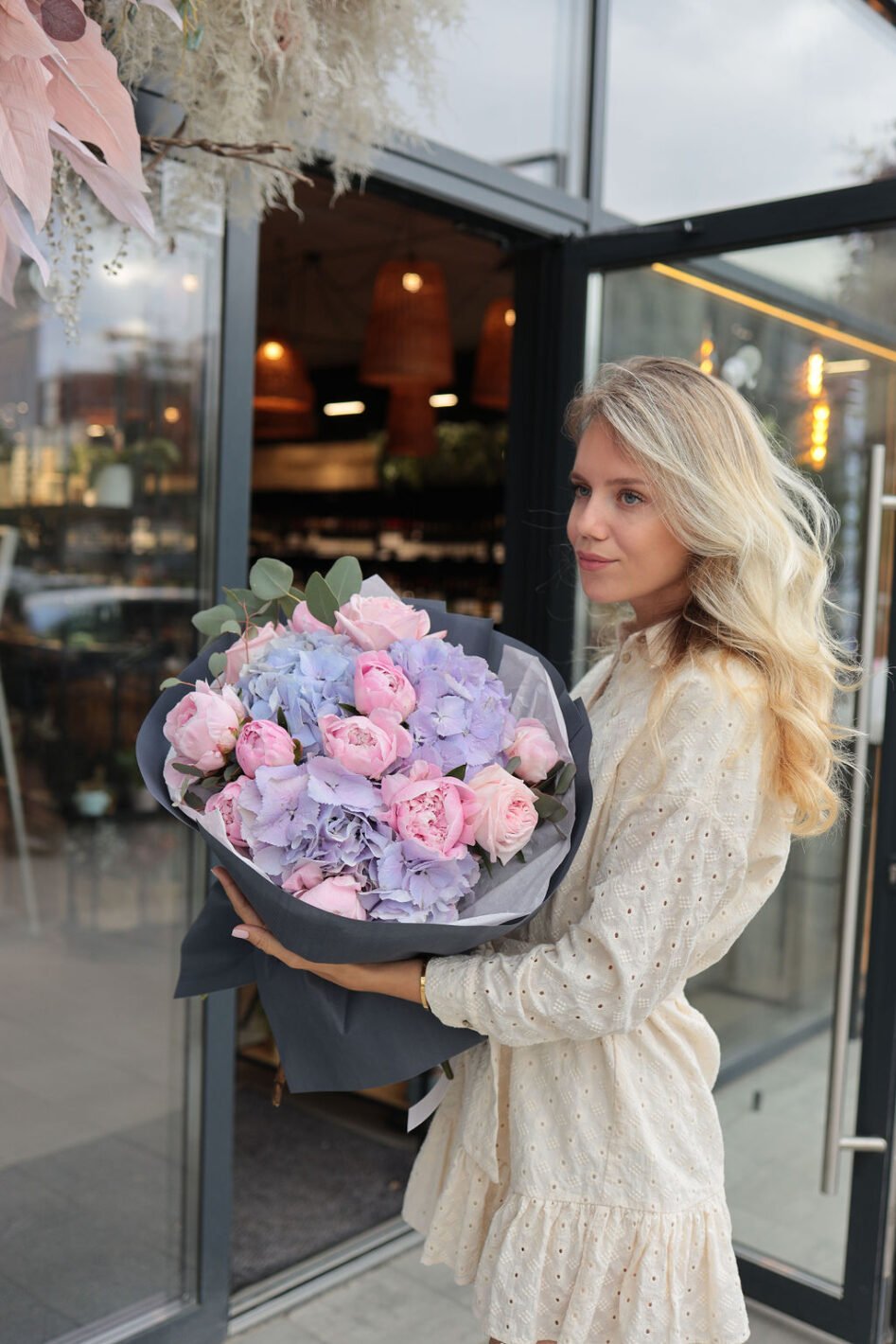 Букет з фіолетовими гортензіями та піонами Сара Бернард