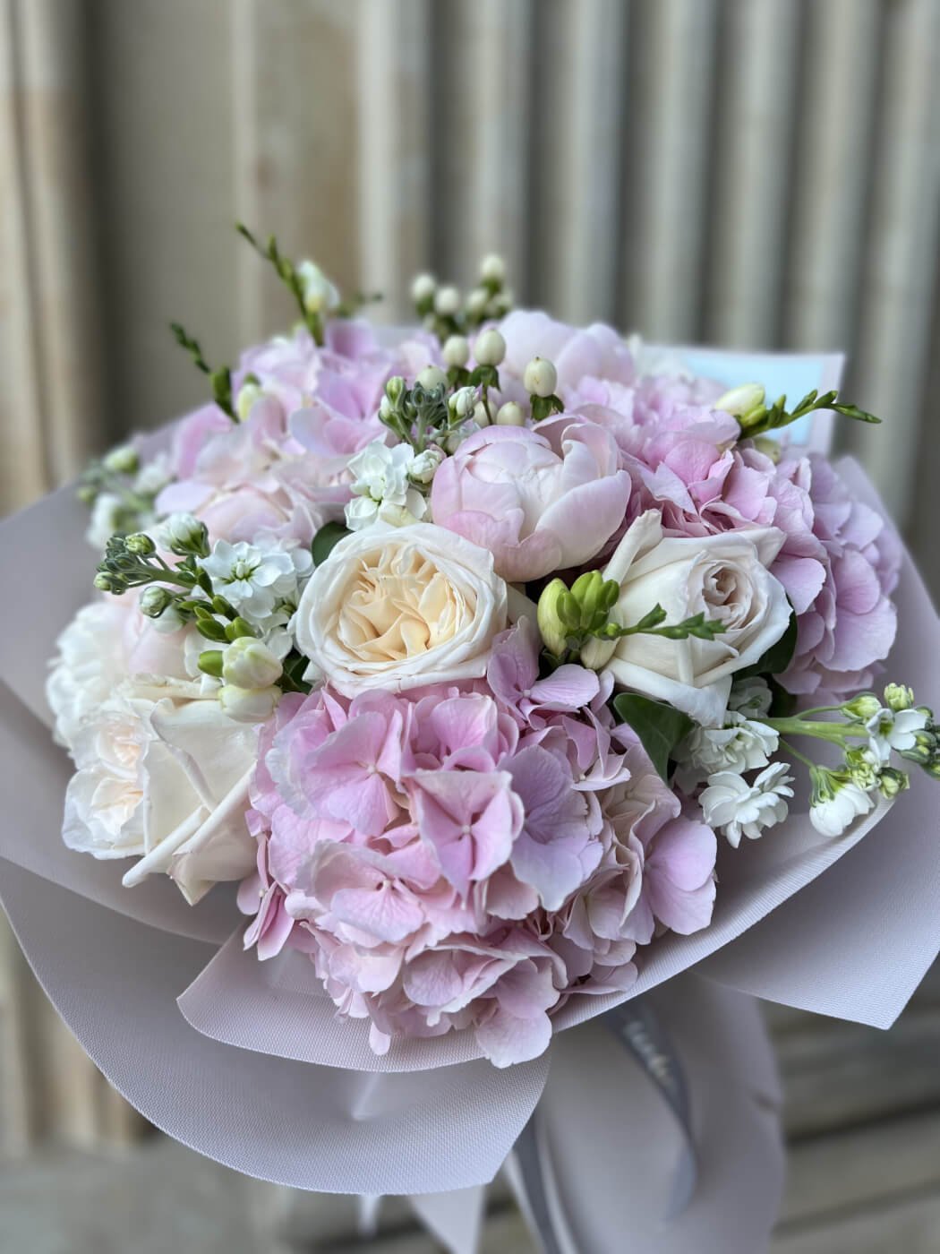 Букет з гортензій, піоновидних троянд та фрезій