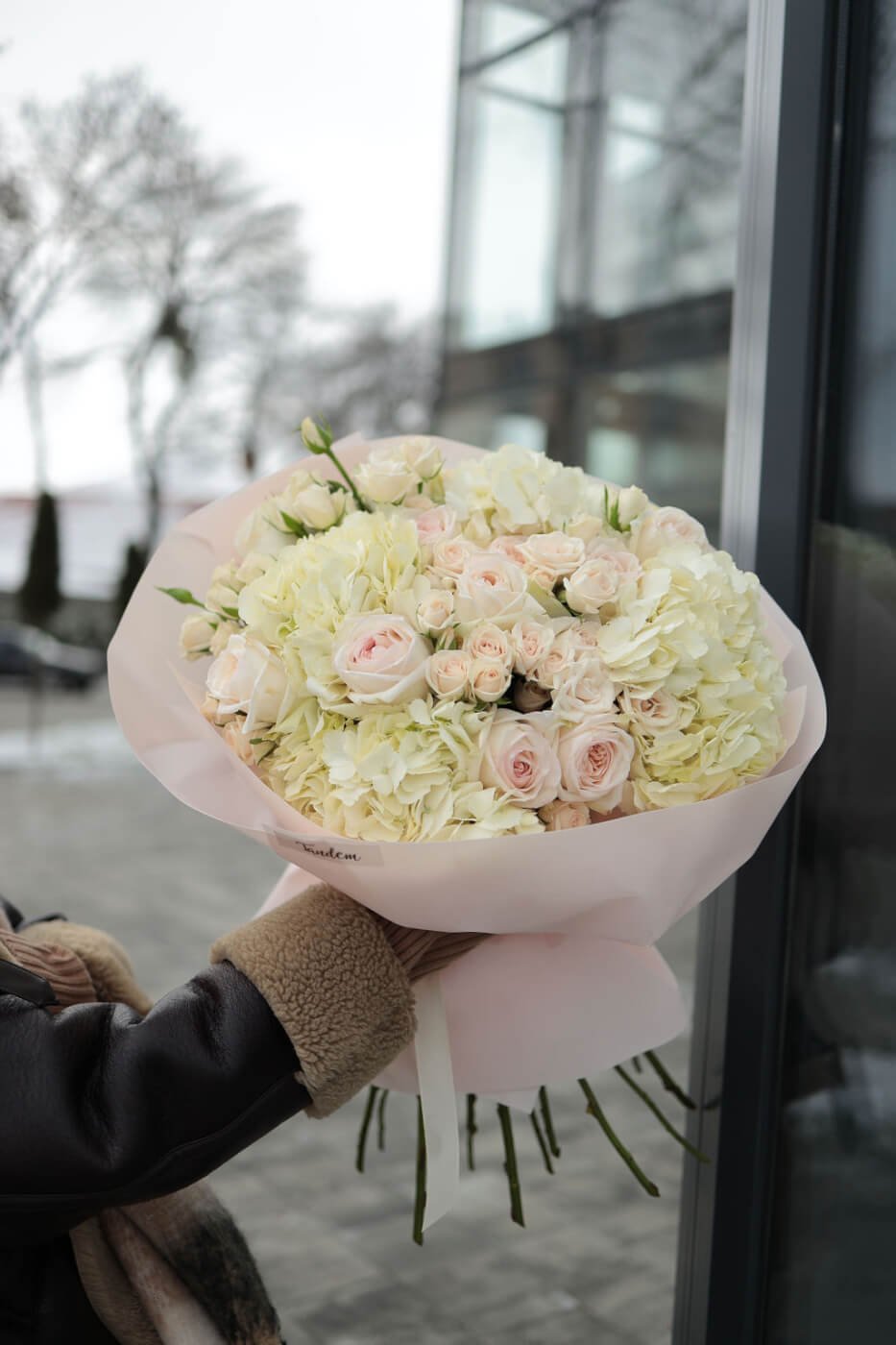 Букет з гортензіями та піоновидними трояндами