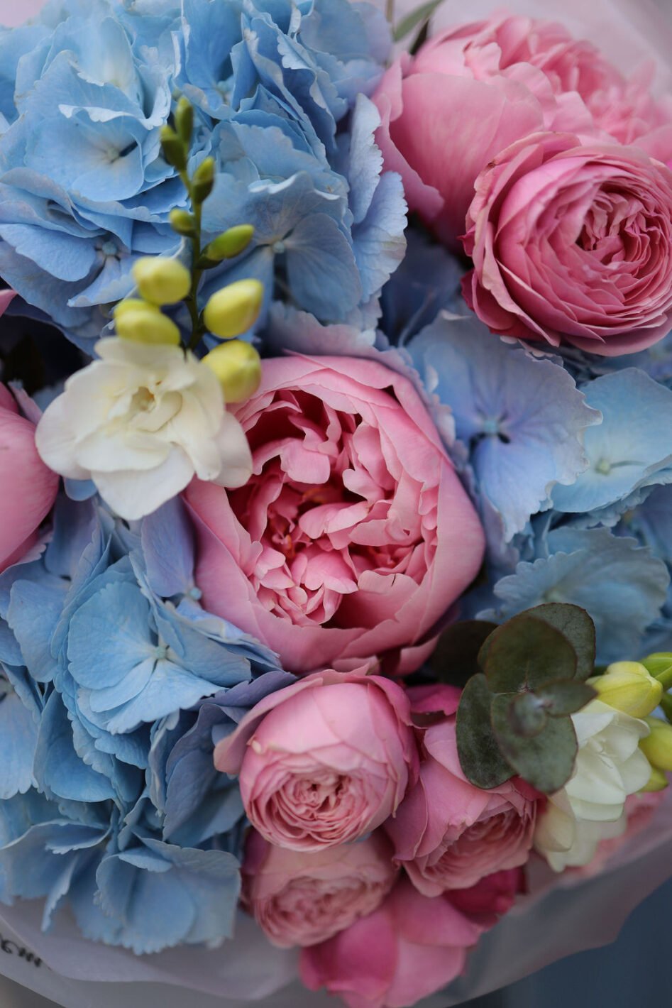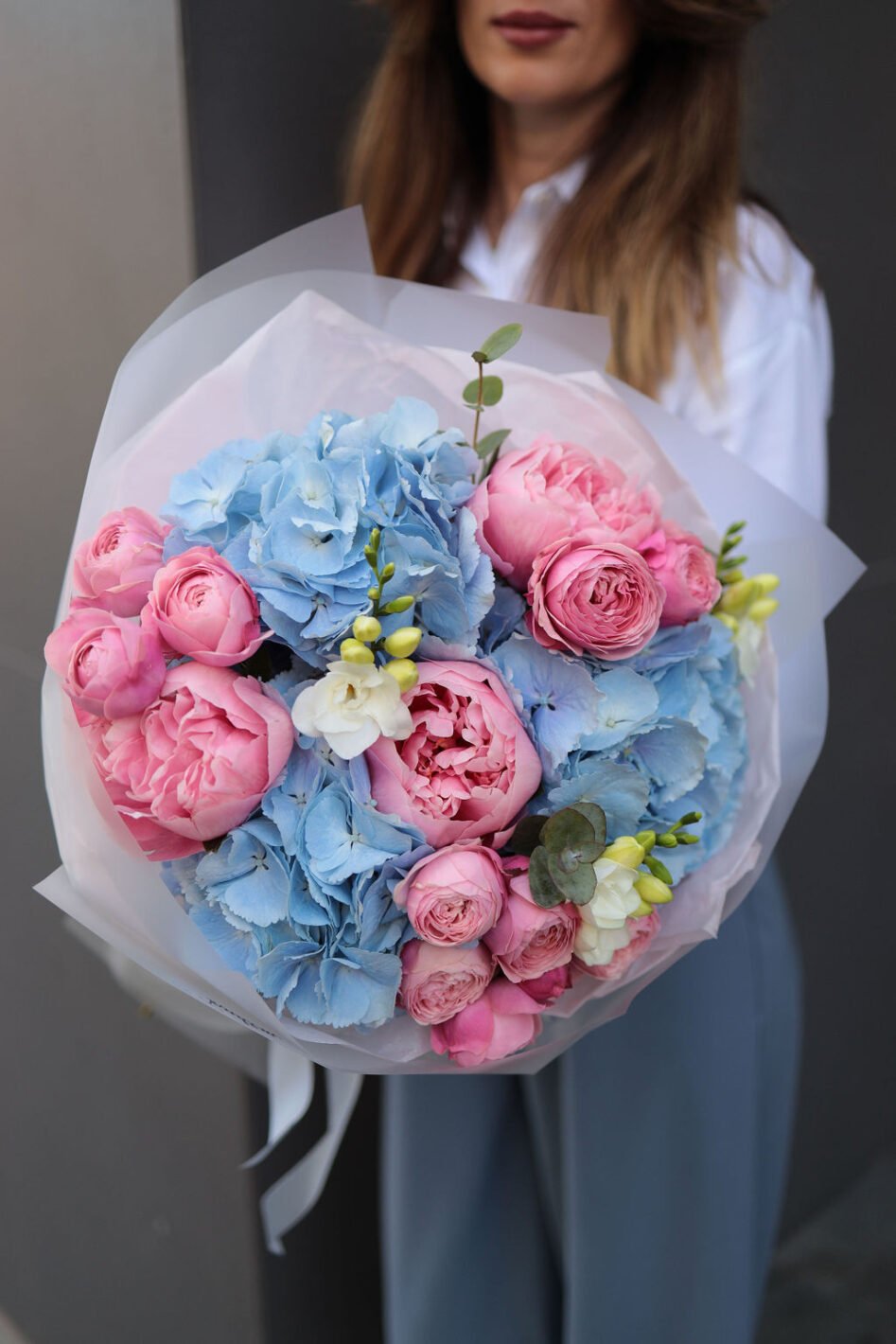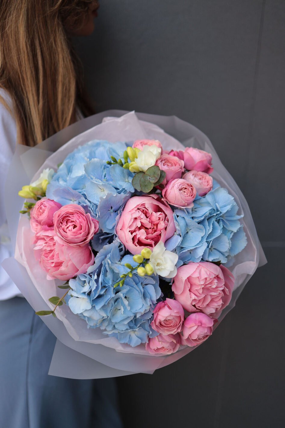 Букет з гортензією, півоніями Етчед салмон та піоновидними трояндами
