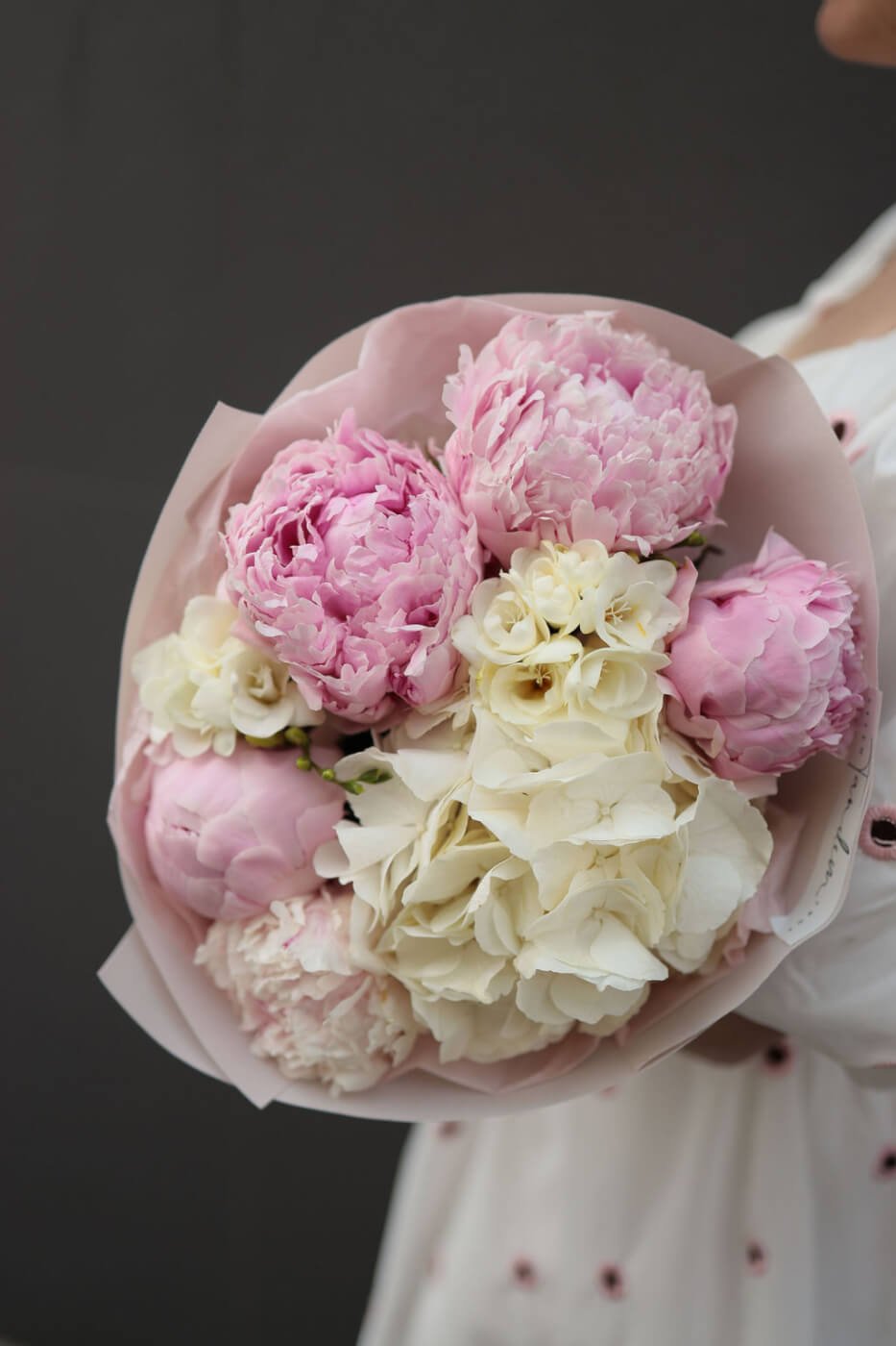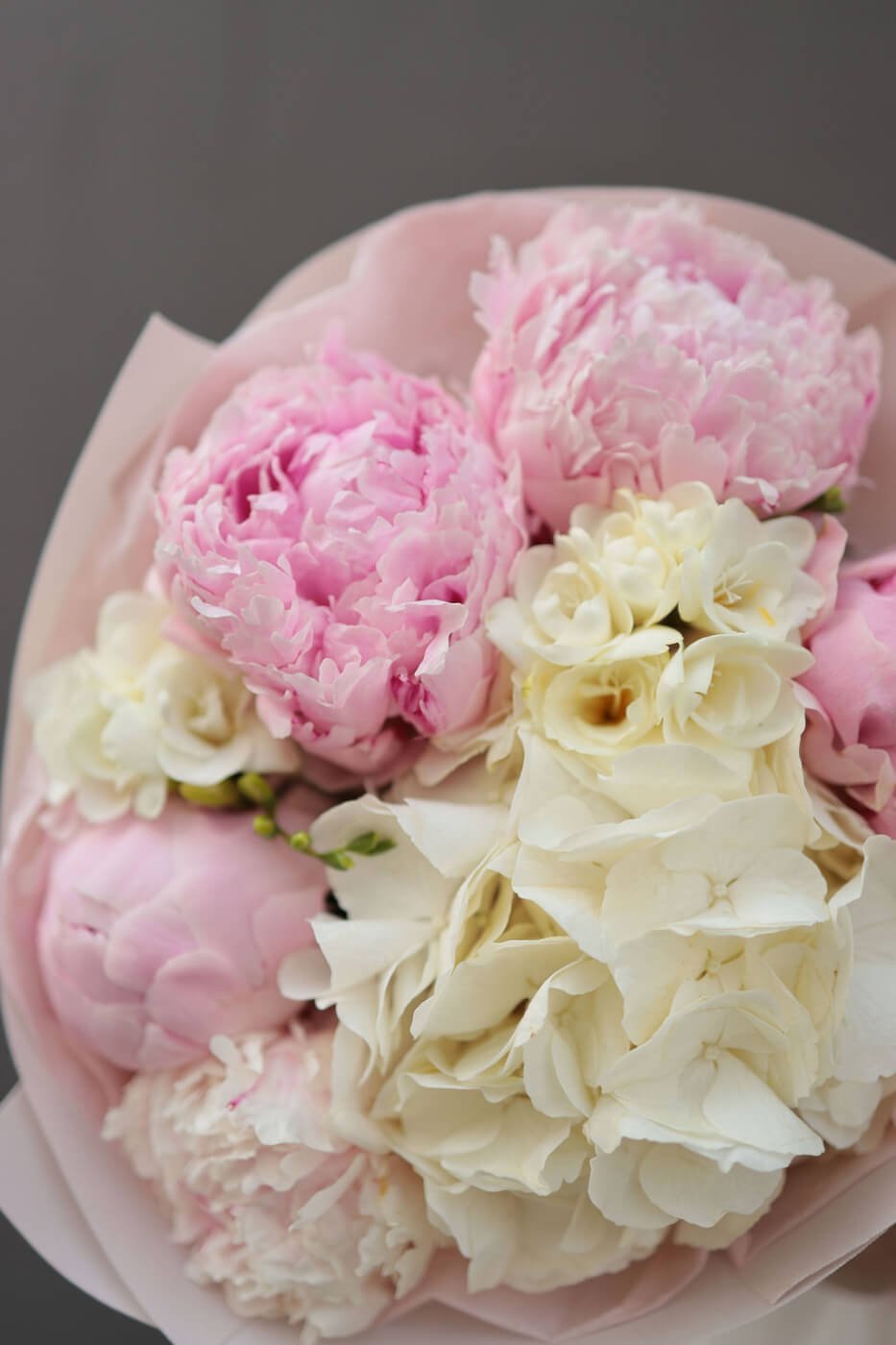Букет з гортензією, півоніями Сара Бернард та фрезією