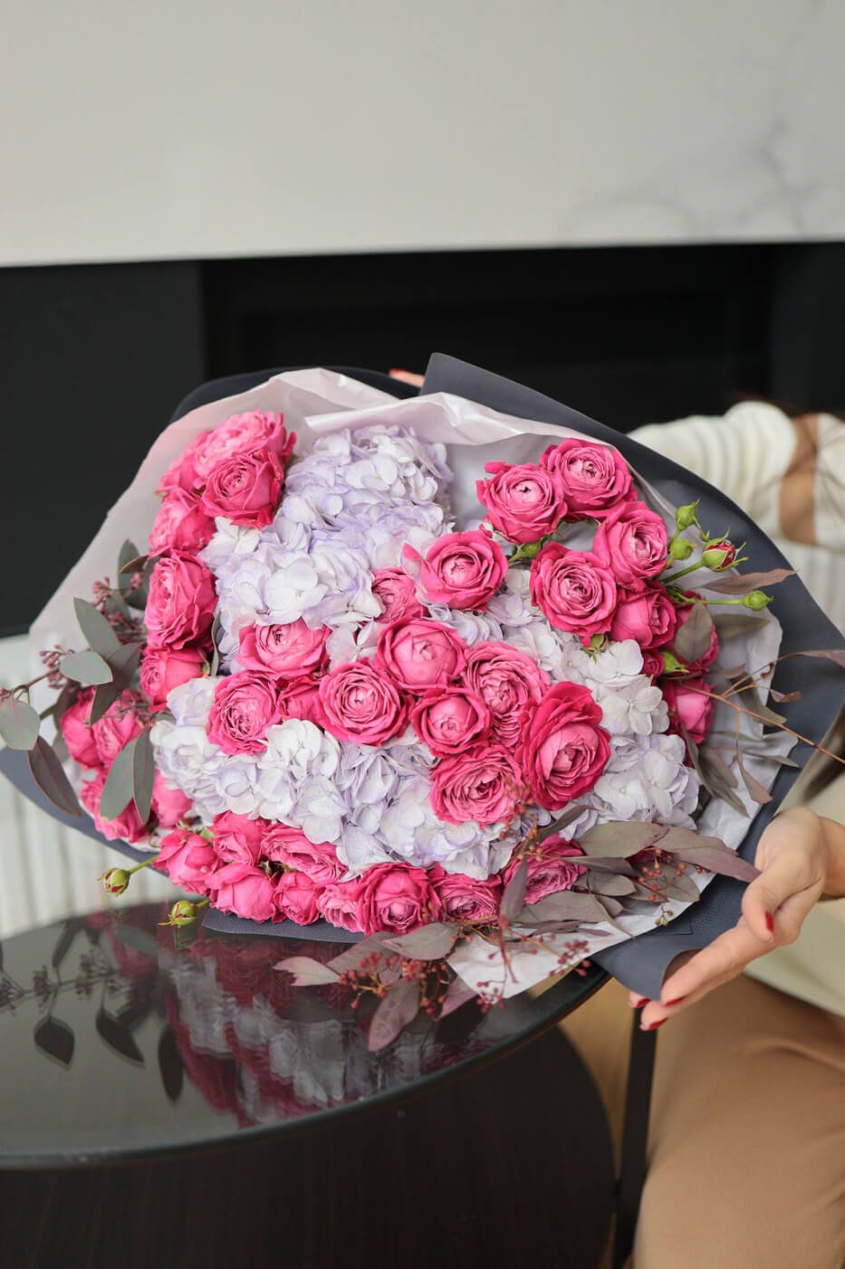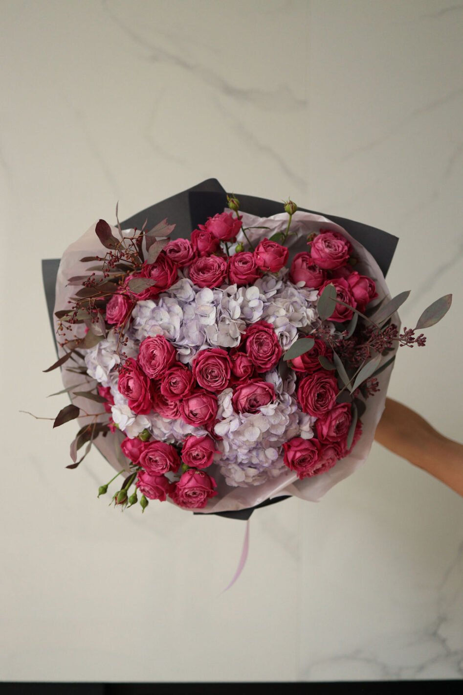 Букет з гортензією та піоновидними трояндами Марвеловс баблз