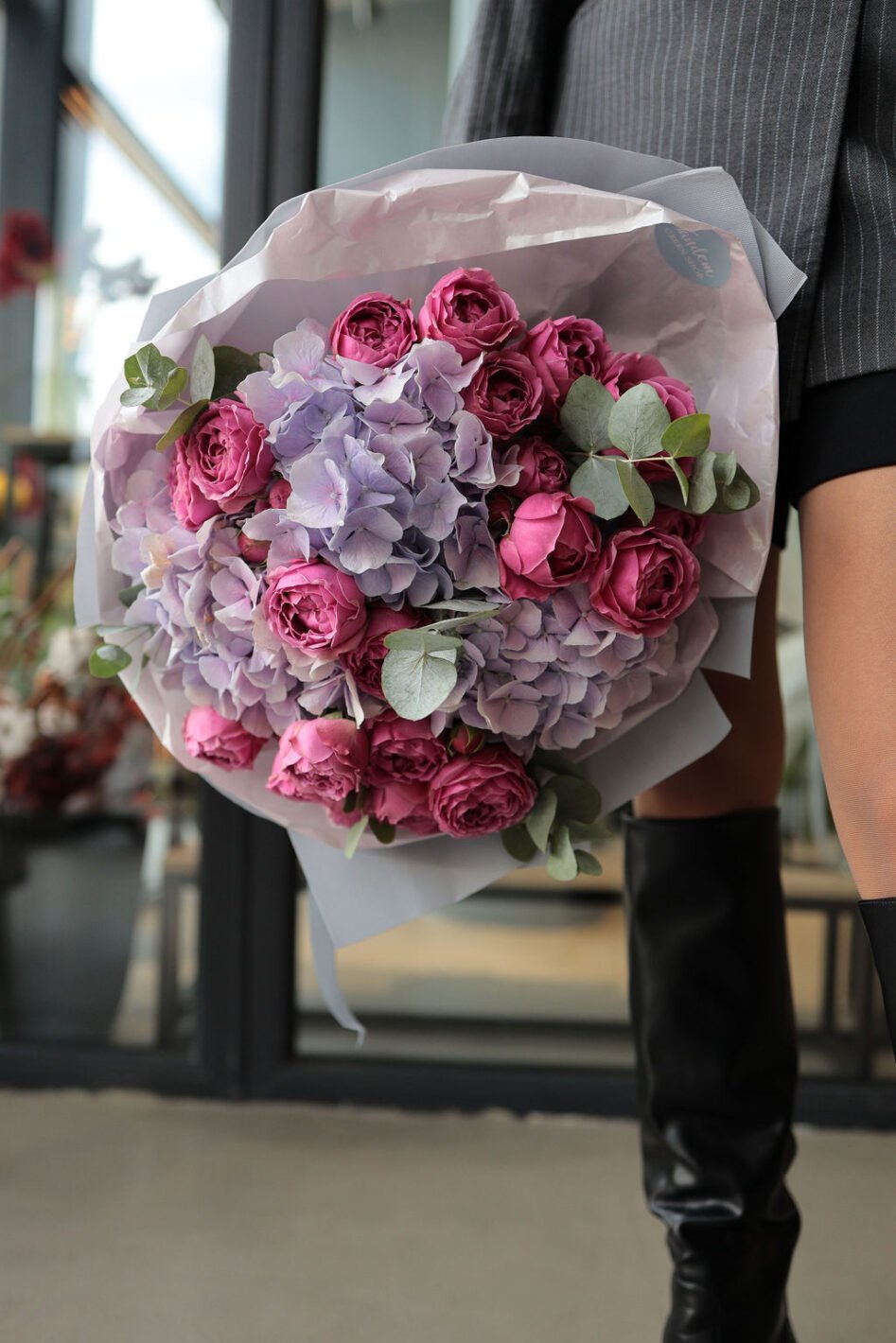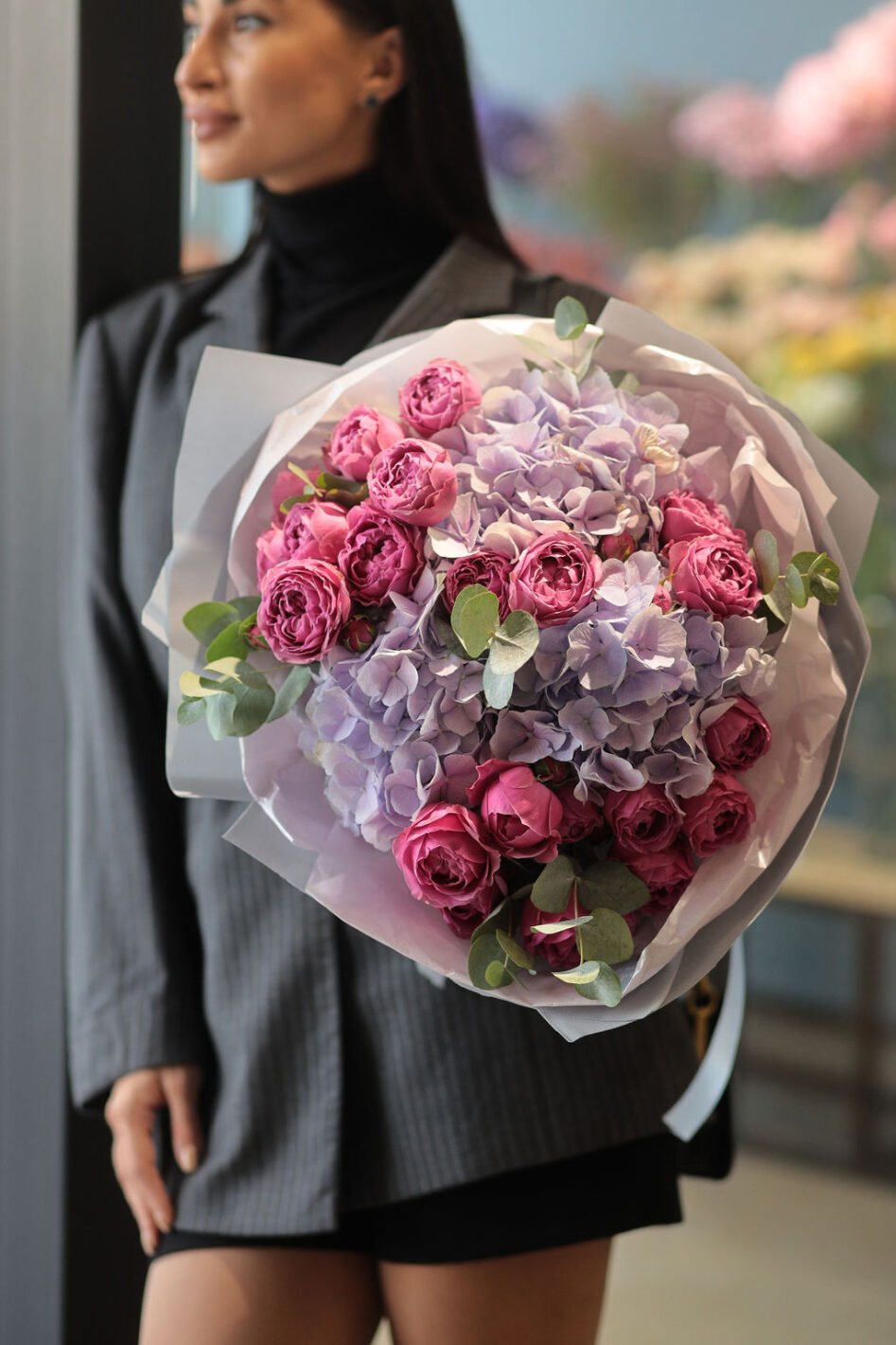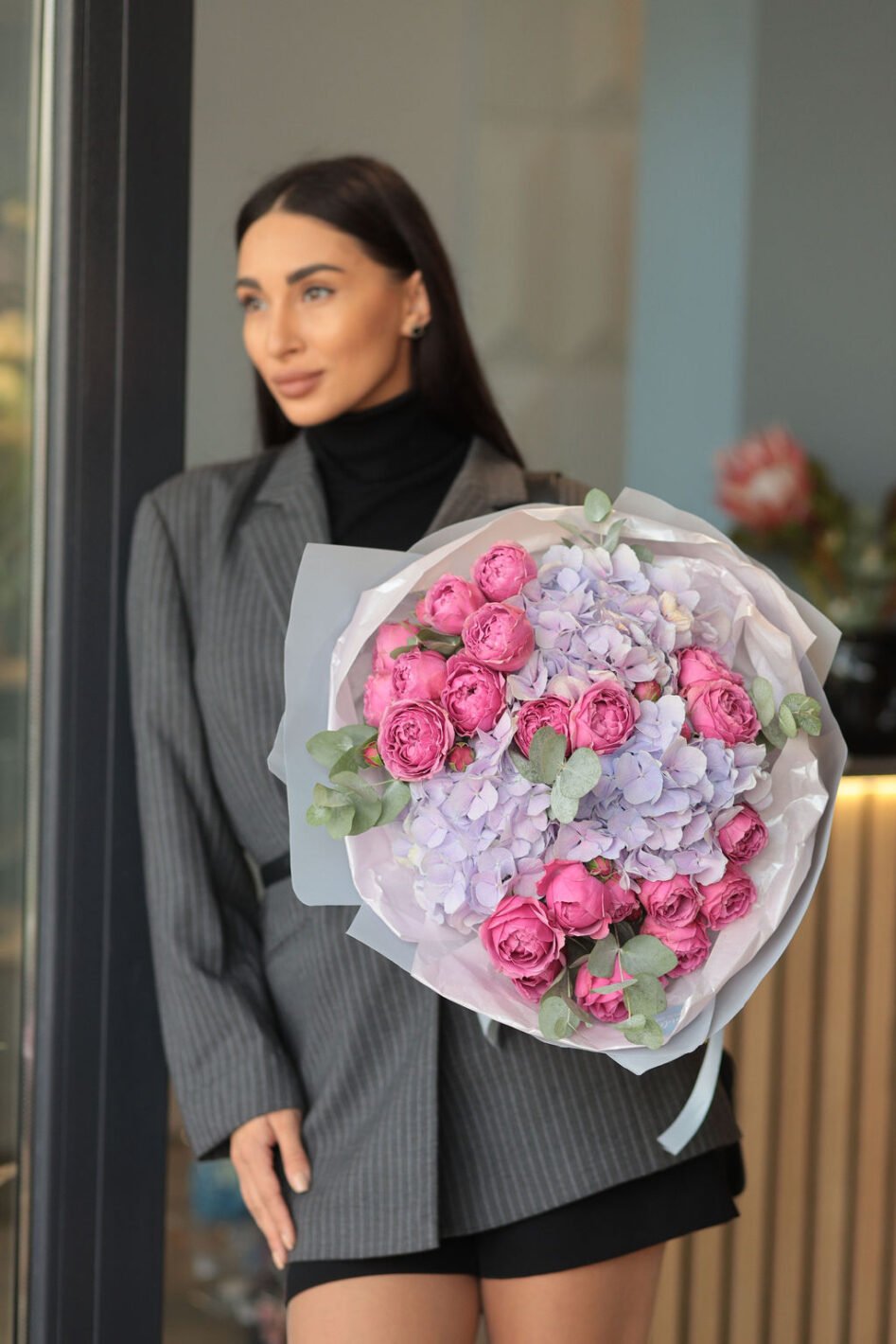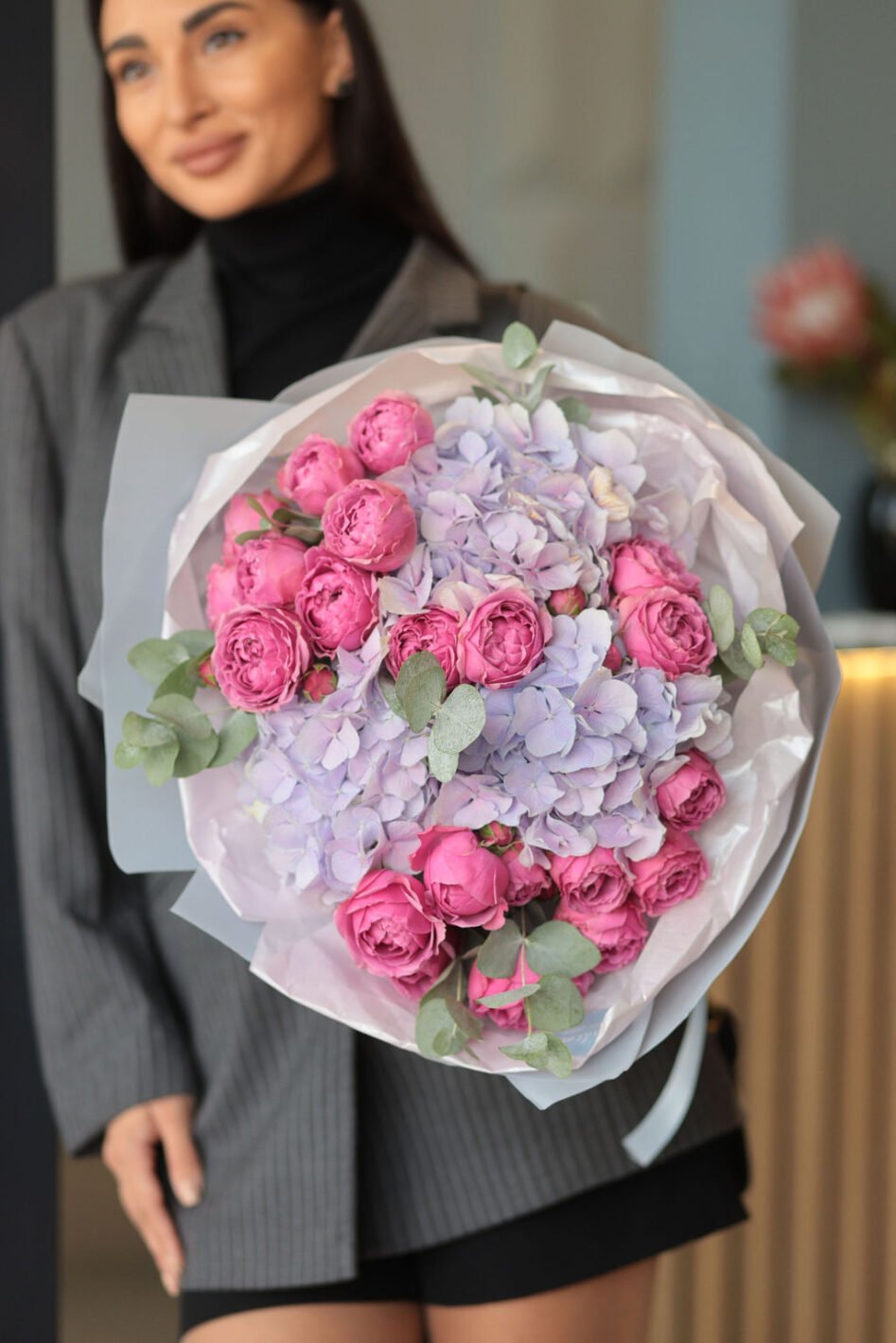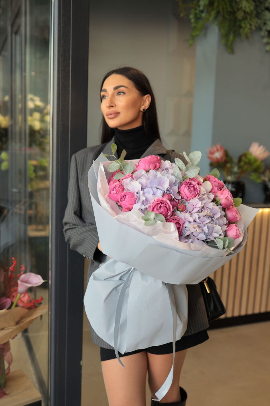Букет з гортензією та піоновидними трояндами Місті баблз