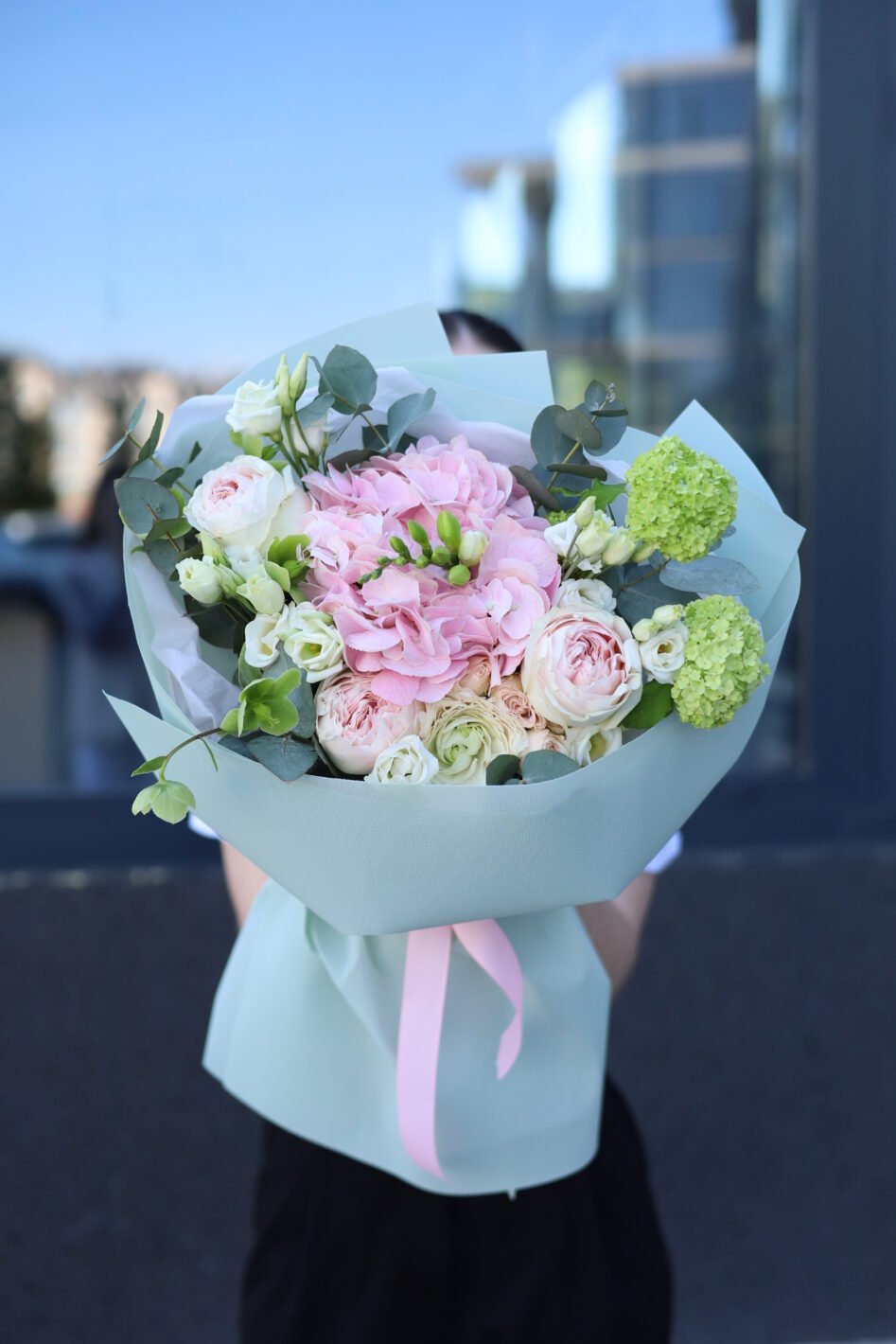 Букет з гортензією, вібірнуном на трояндами Лорена