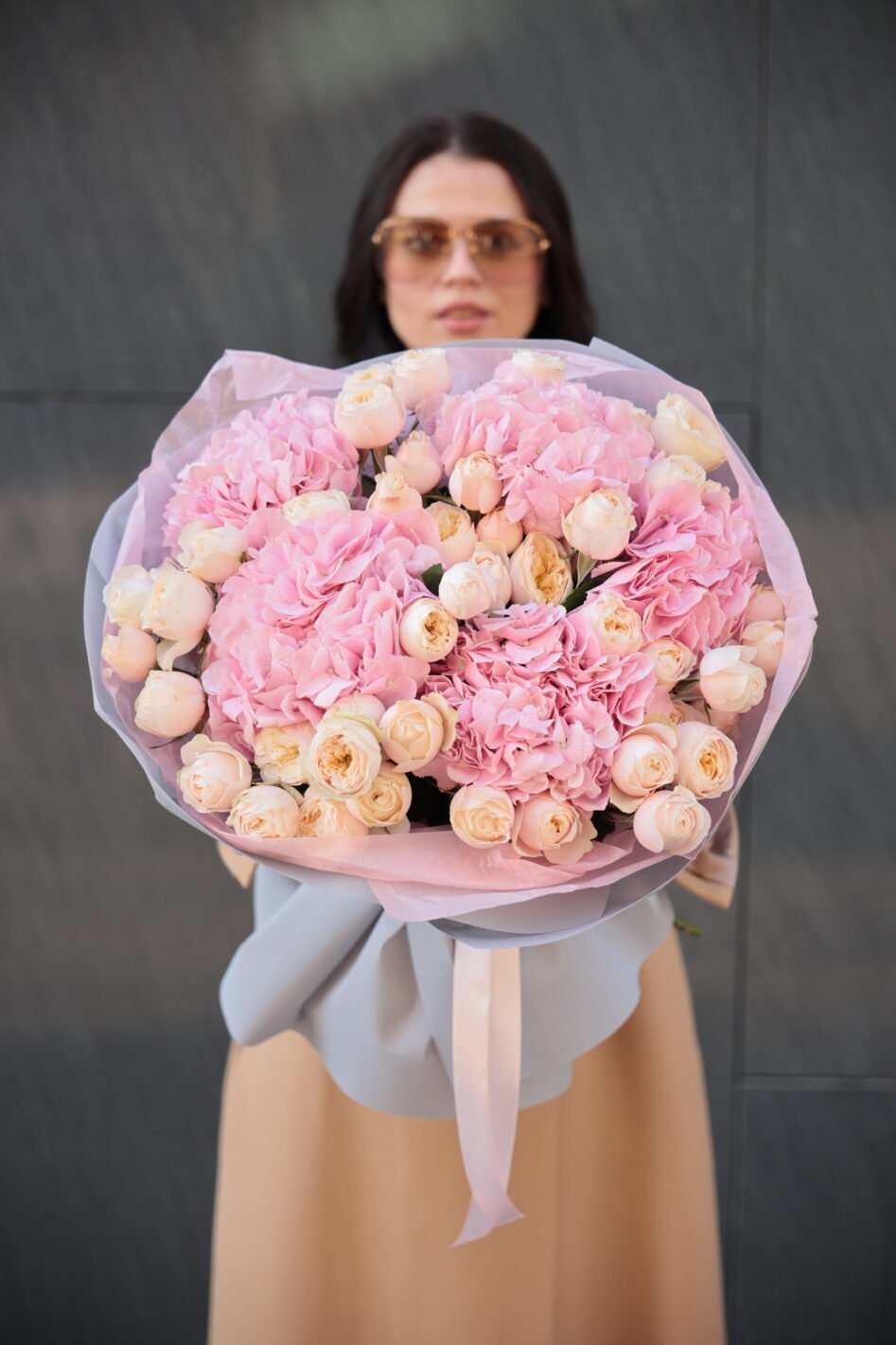 Букет з піоновидних троянд Дарлінгтон та гортензій