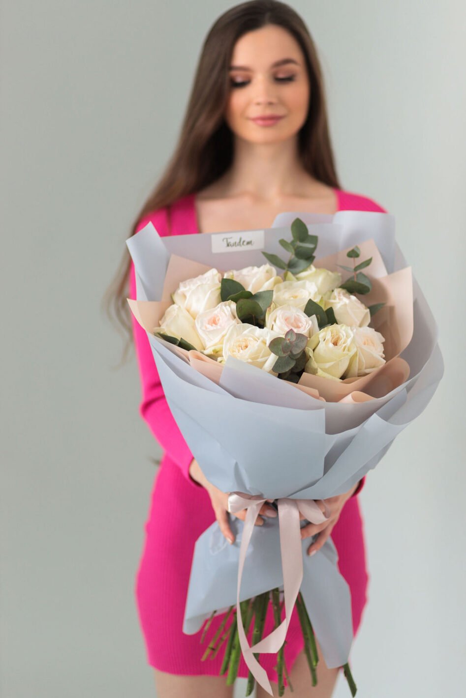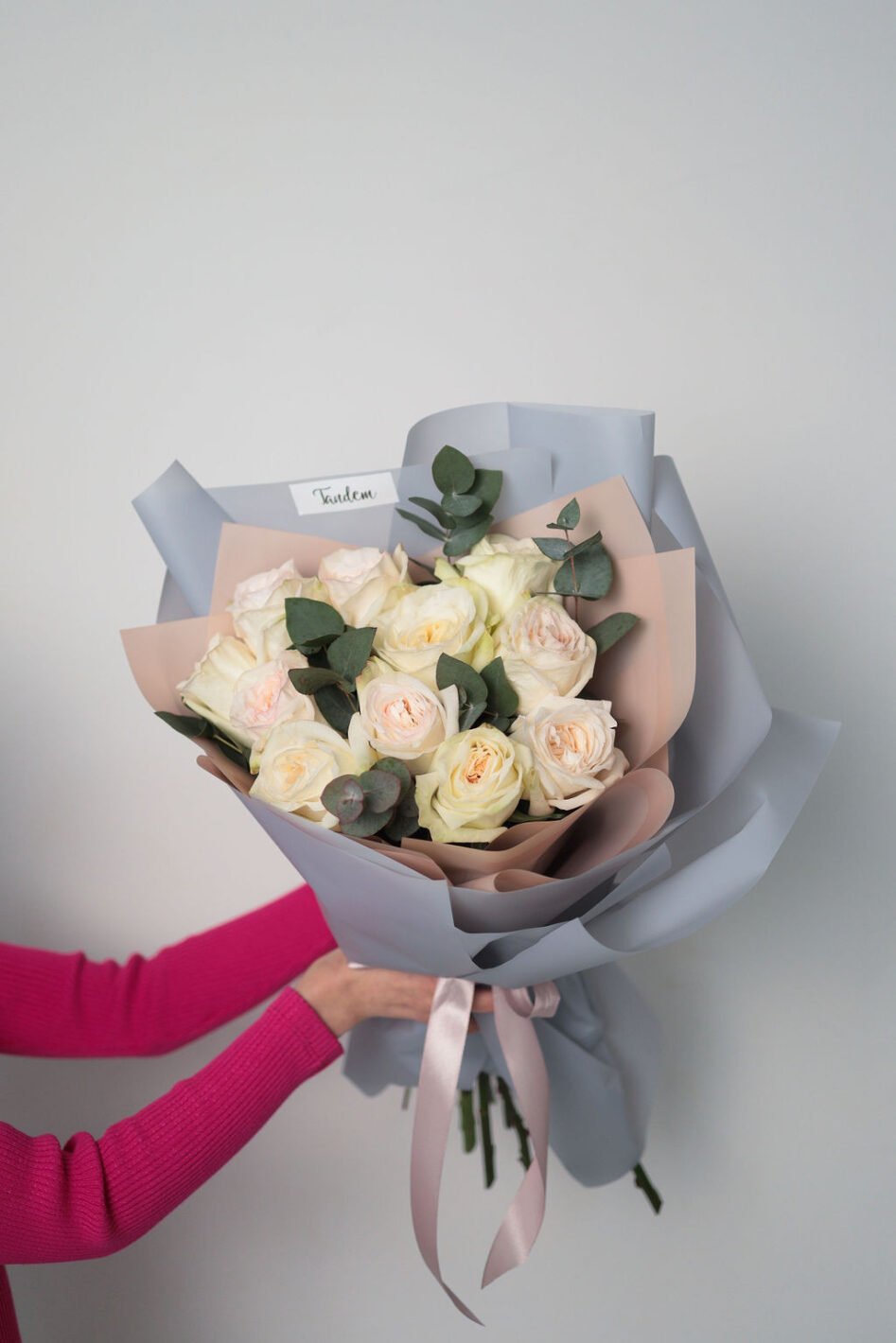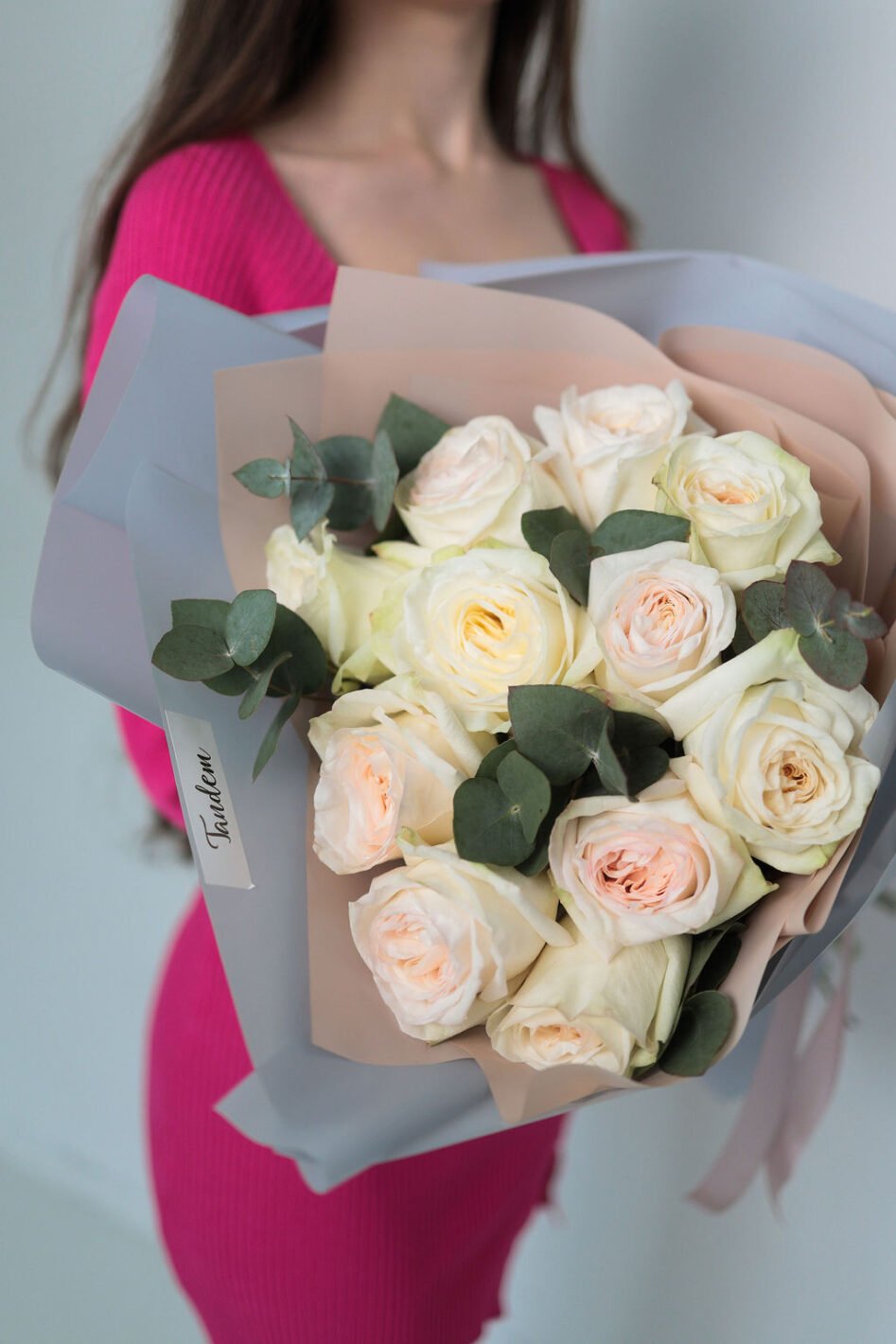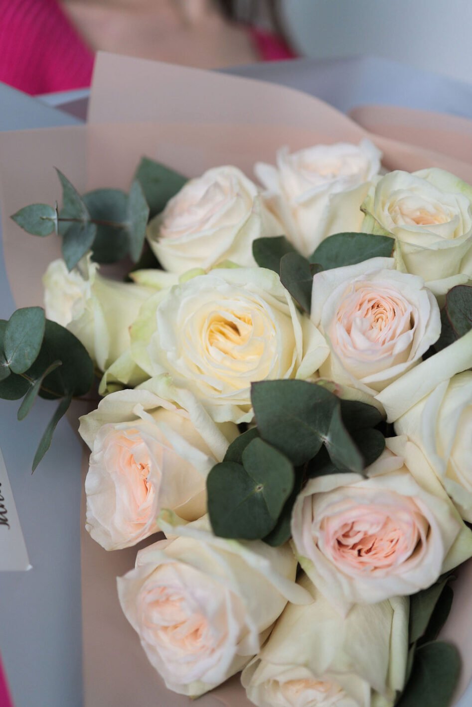 Букет з 11 піоновидних троянд Вайт охара та евкаліпту