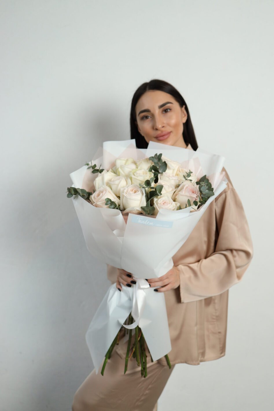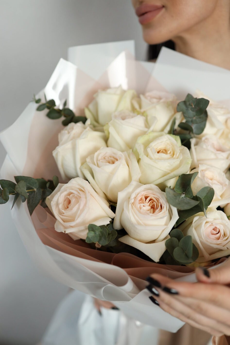 Букет з 15 піоновидних троянд Вайт Охара та евкаліпту