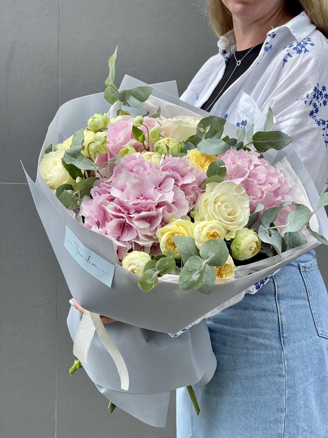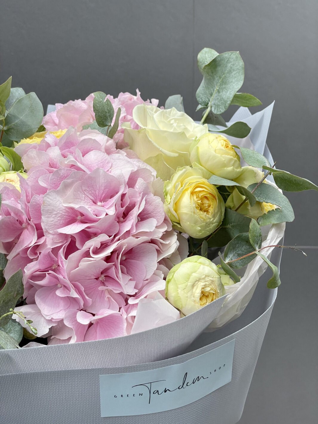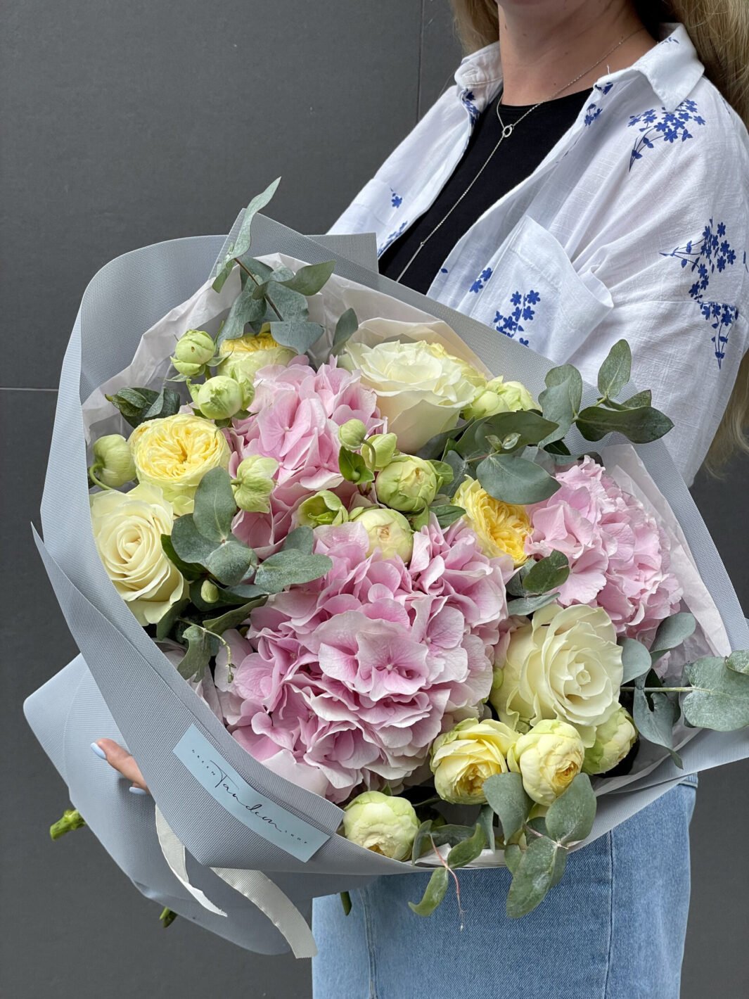 Букет з рожевими гортензіями та піоновидними трояндами Піоні Баблз
