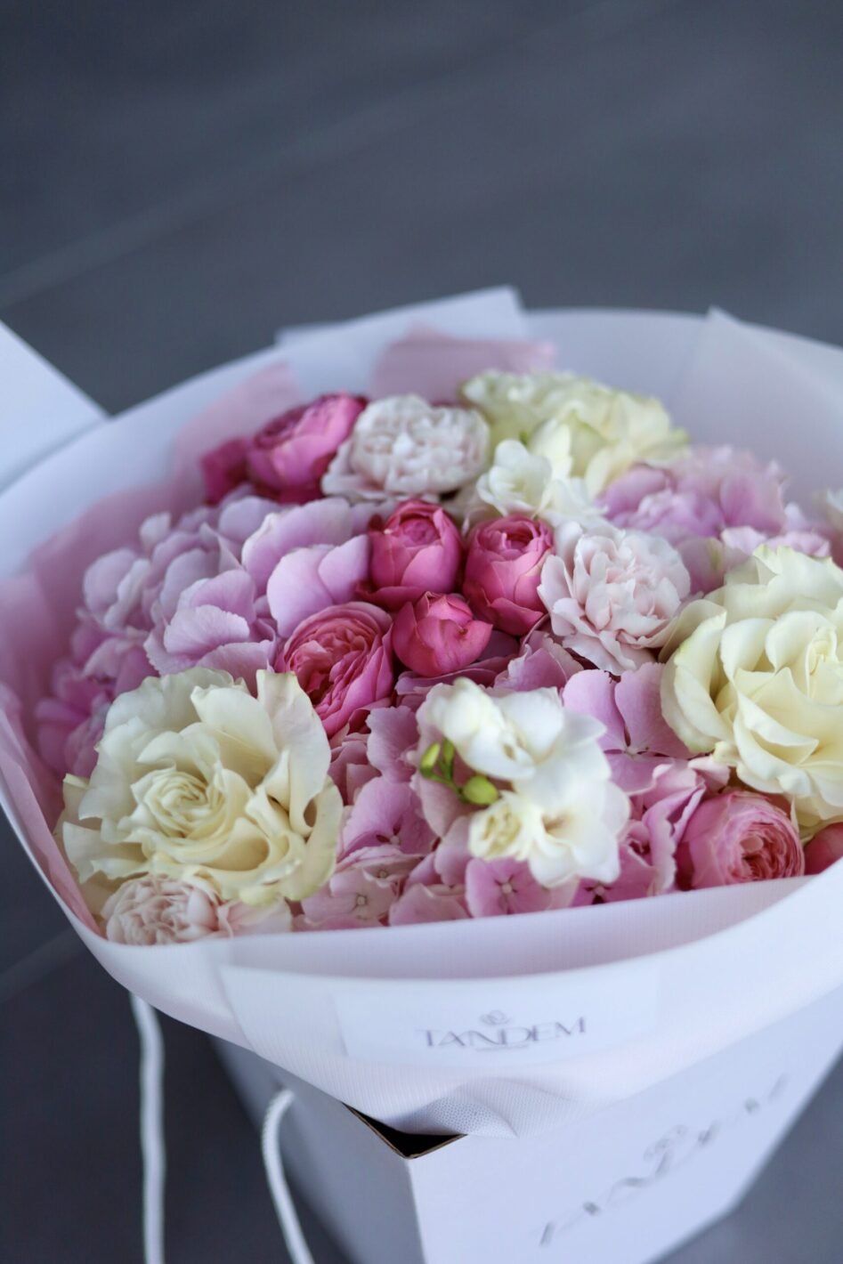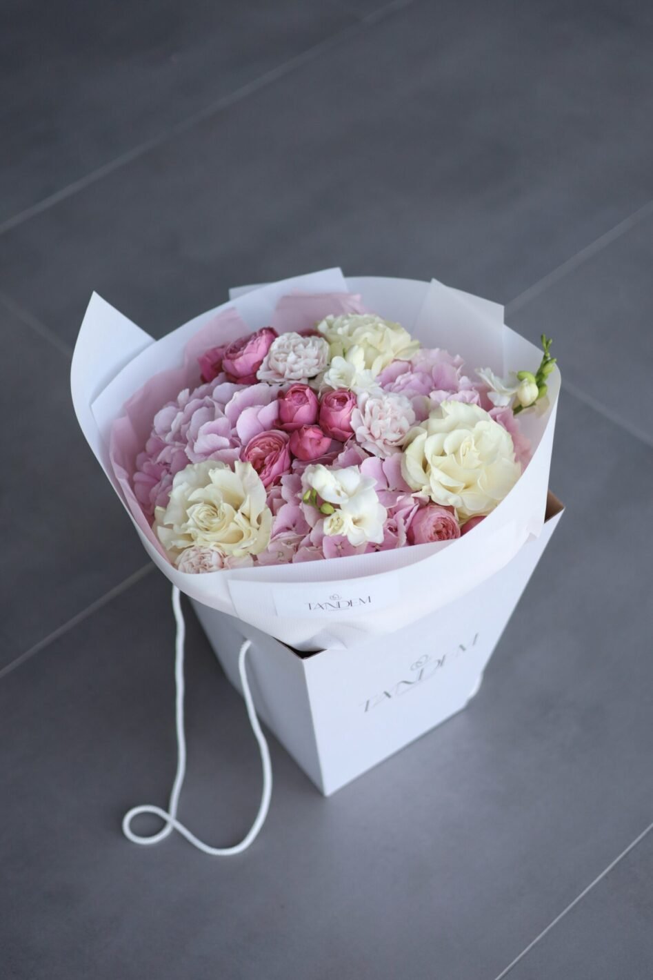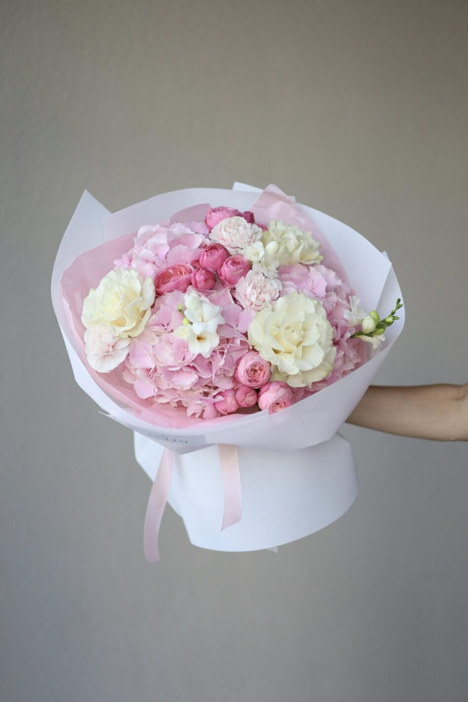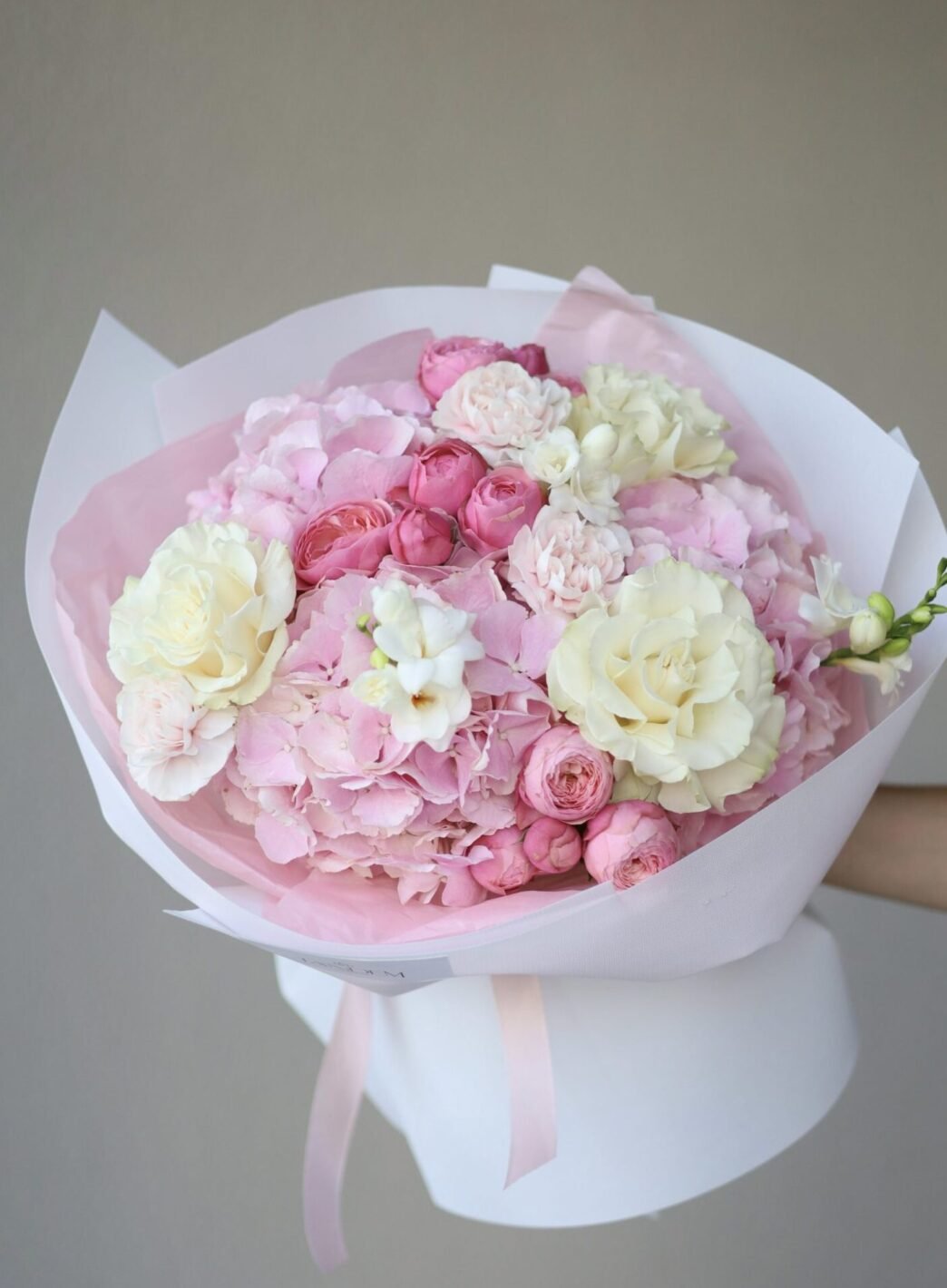 Букет з рожевими гортензіями та трояндами Мондіаль