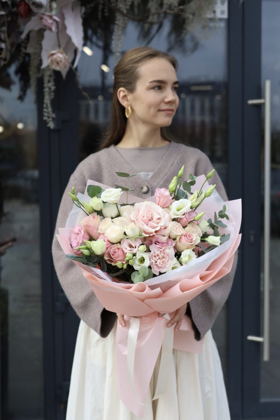 White and pink bouquet with roses, eustoma