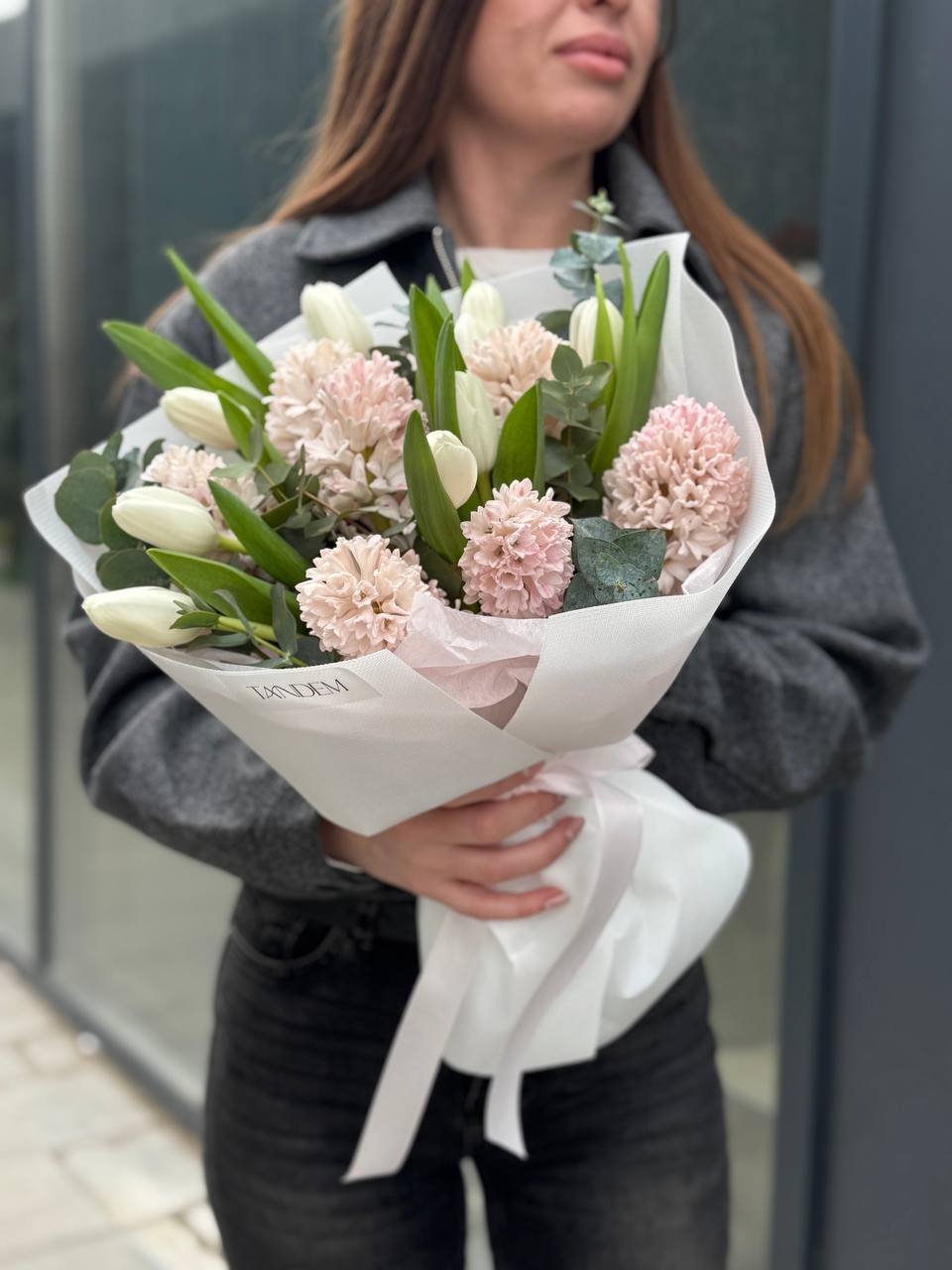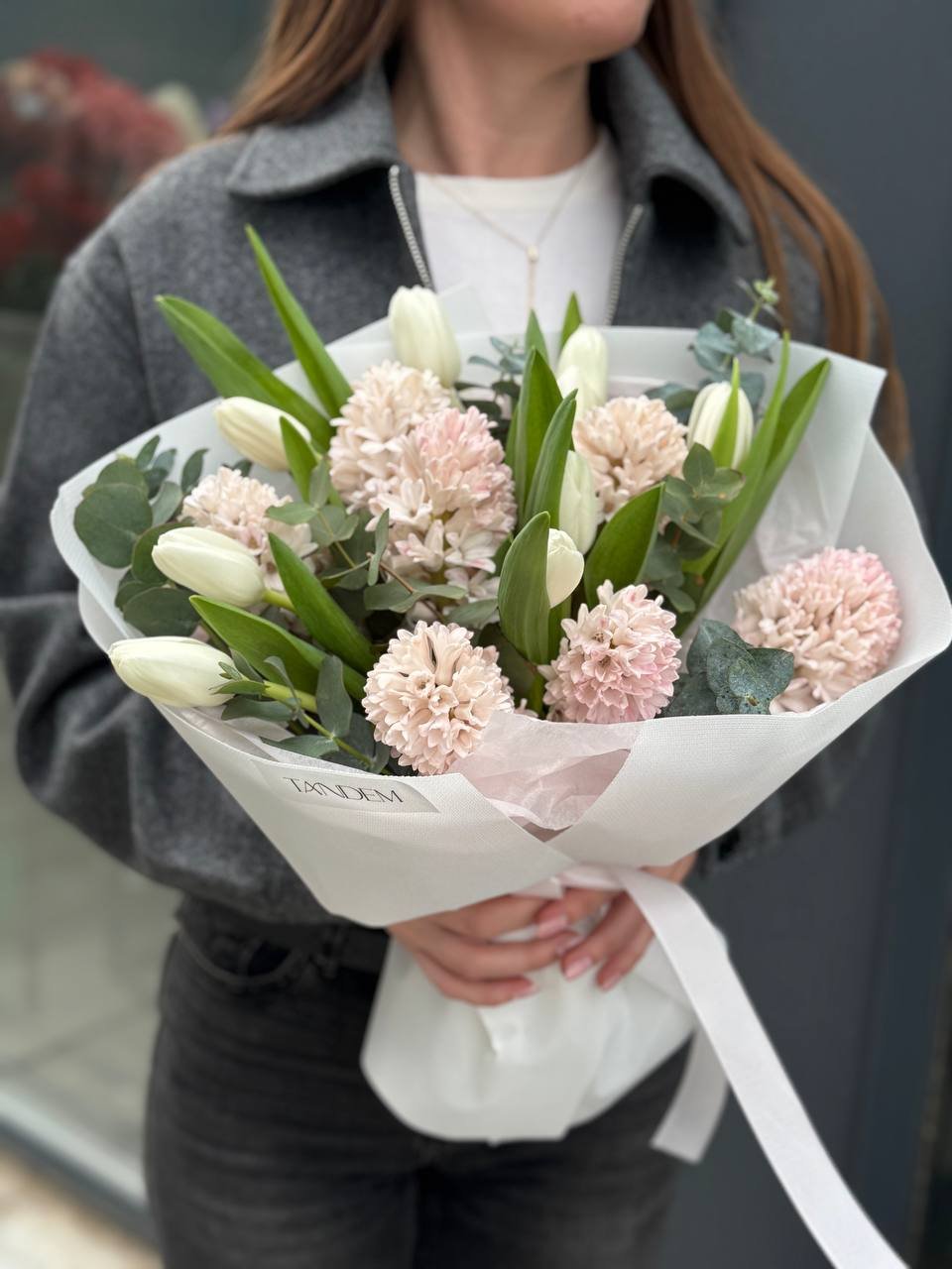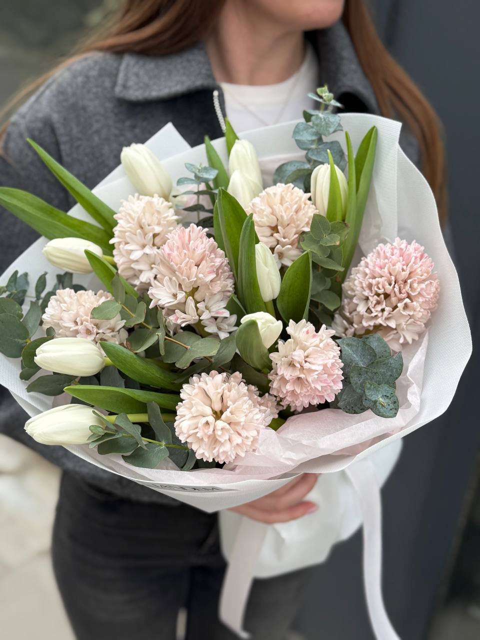 Bouquet of white tulips and hyacinths