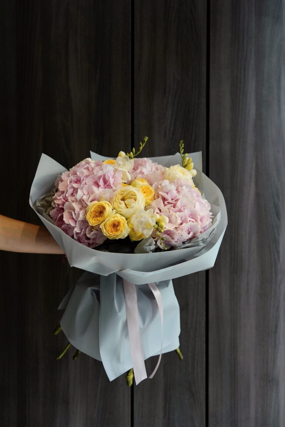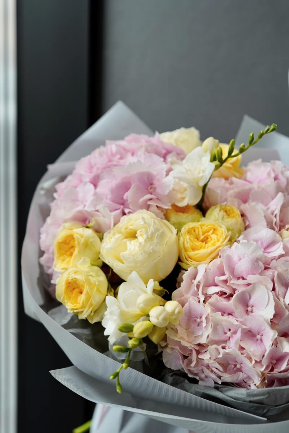 Bouquet with pink hydrangeas, peony roses and freesia
