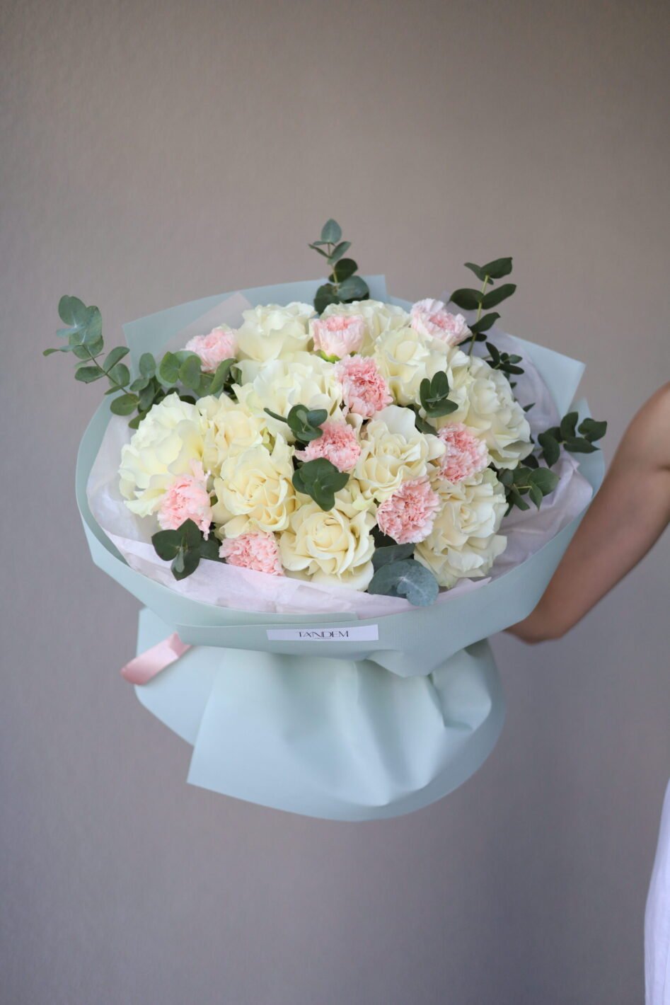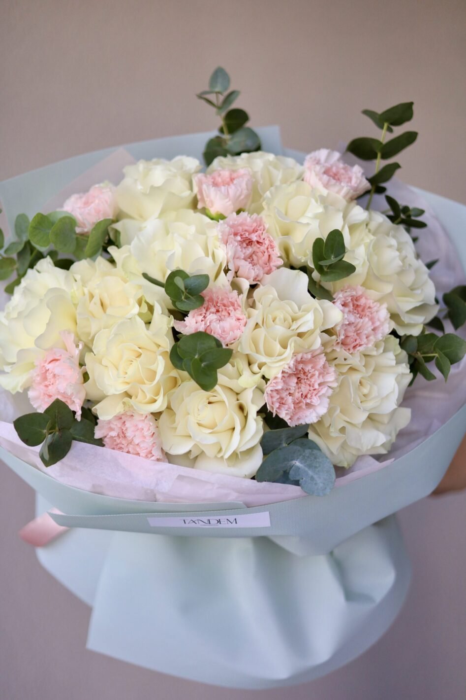 Bouquet of Mondial roses and dianthus