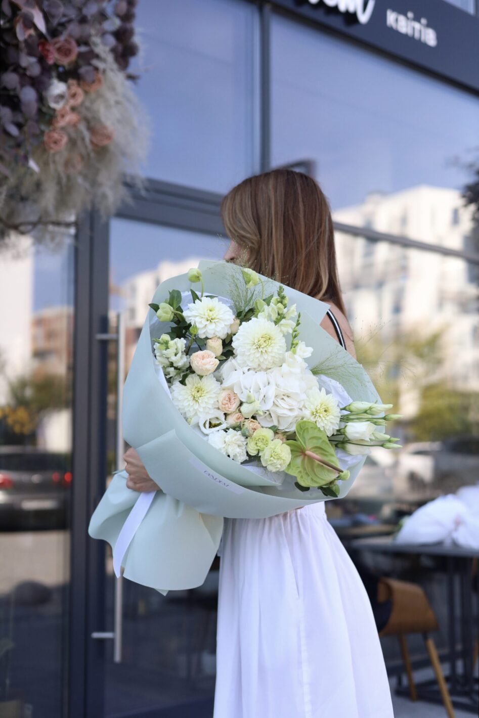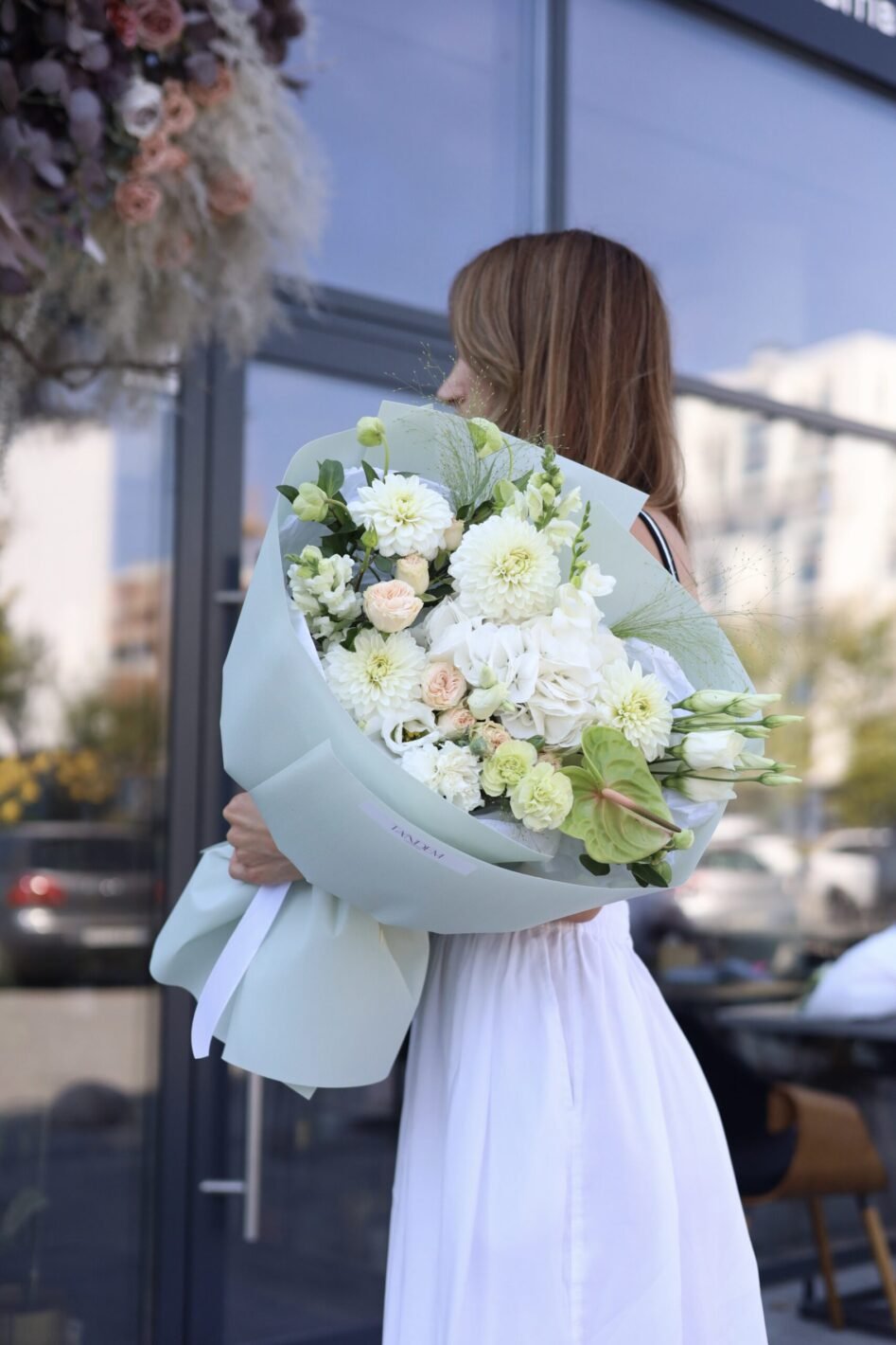 Mix of hydrangeas, dahlias and roses in green colors