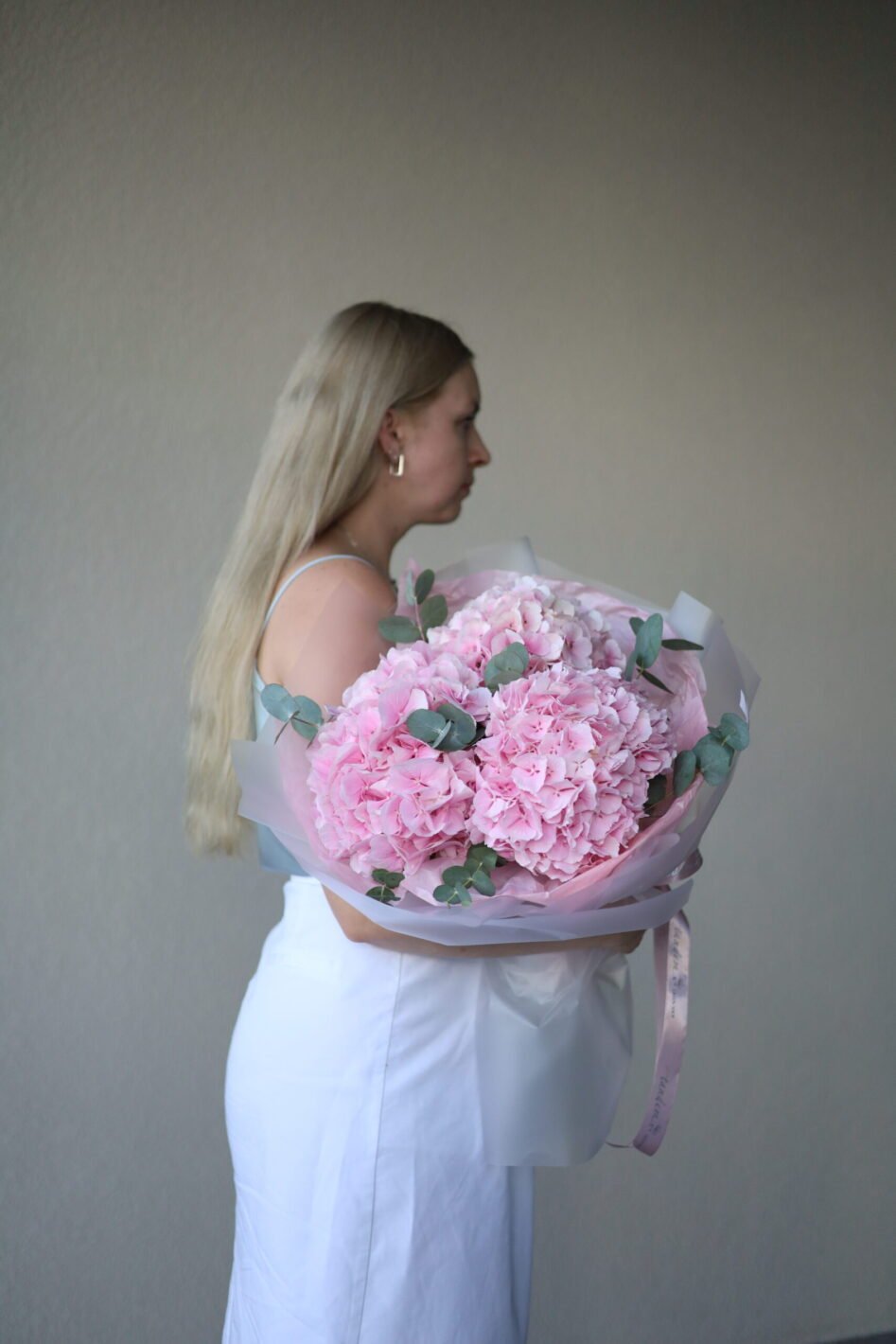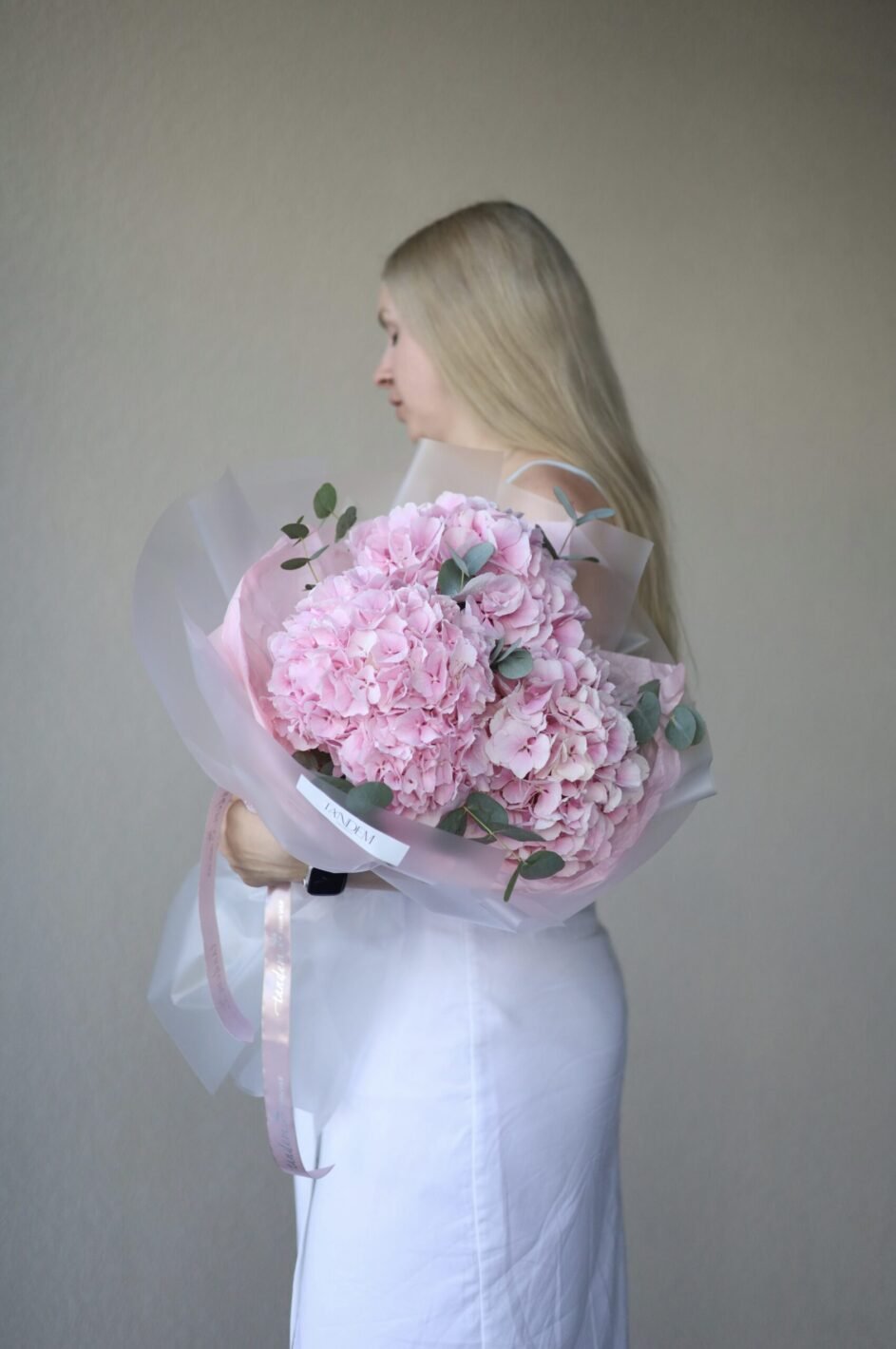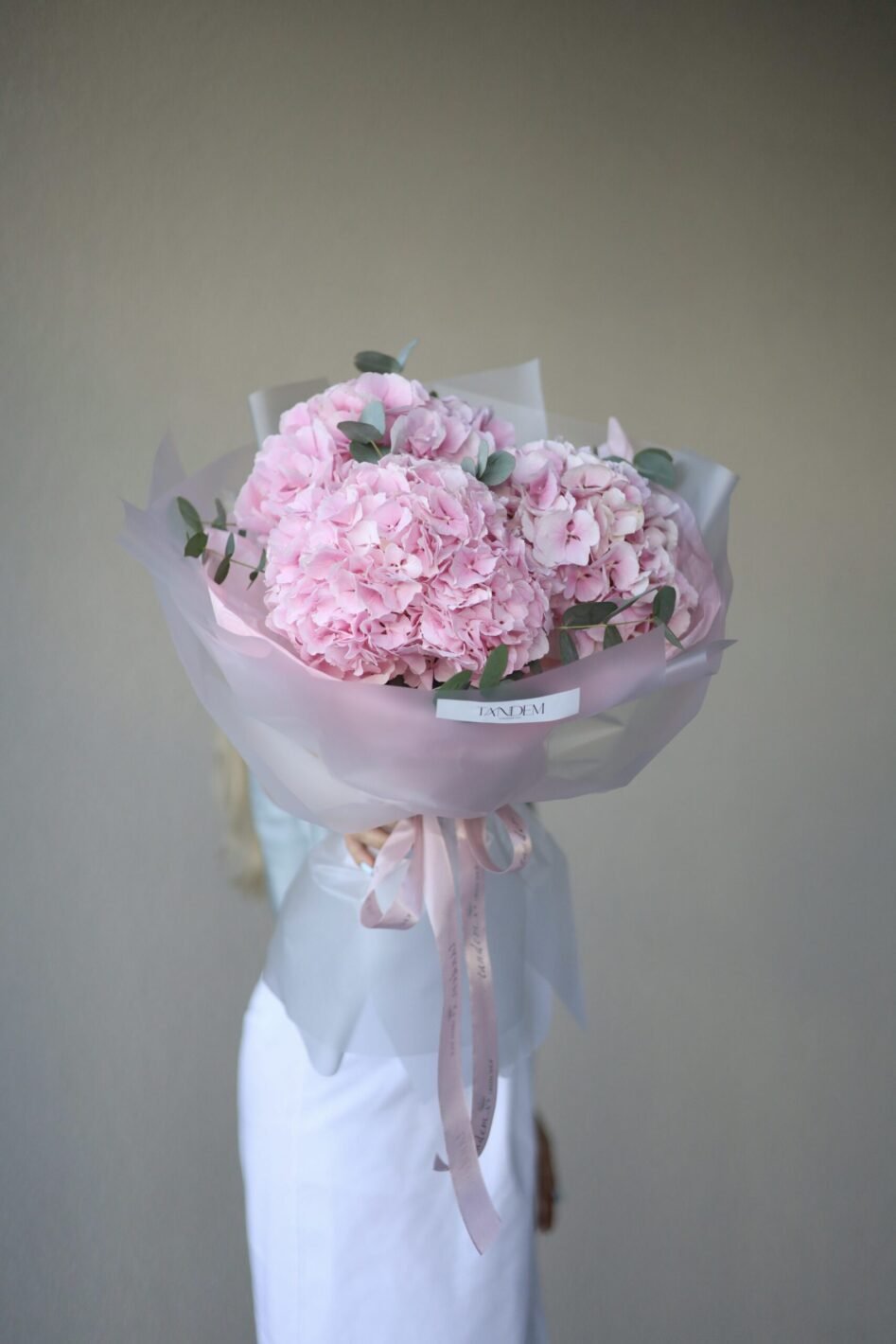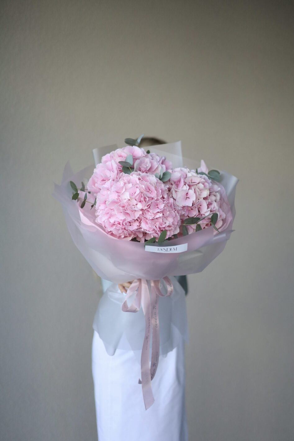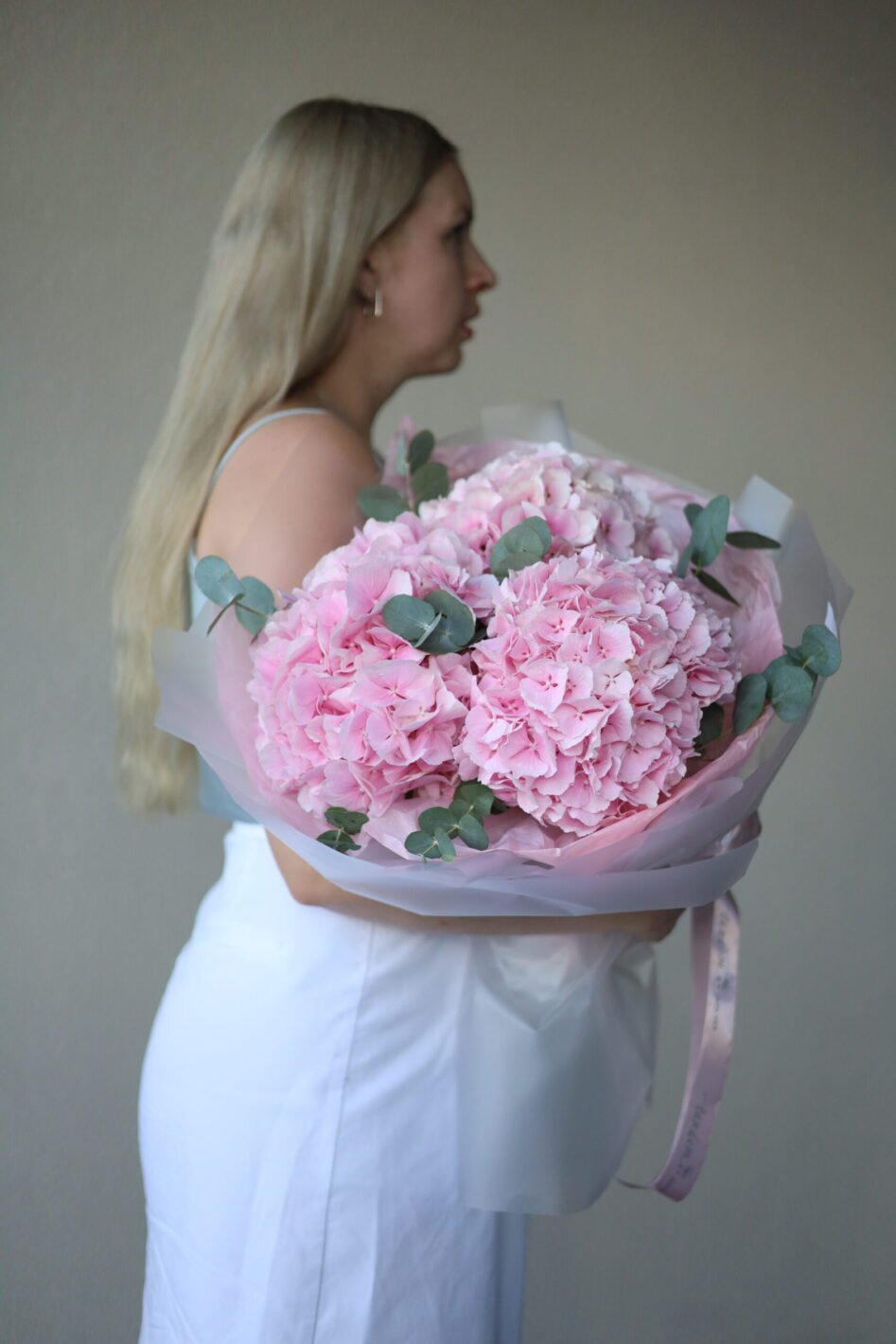 Monobouquet of pink hydrangea with eucalyptus