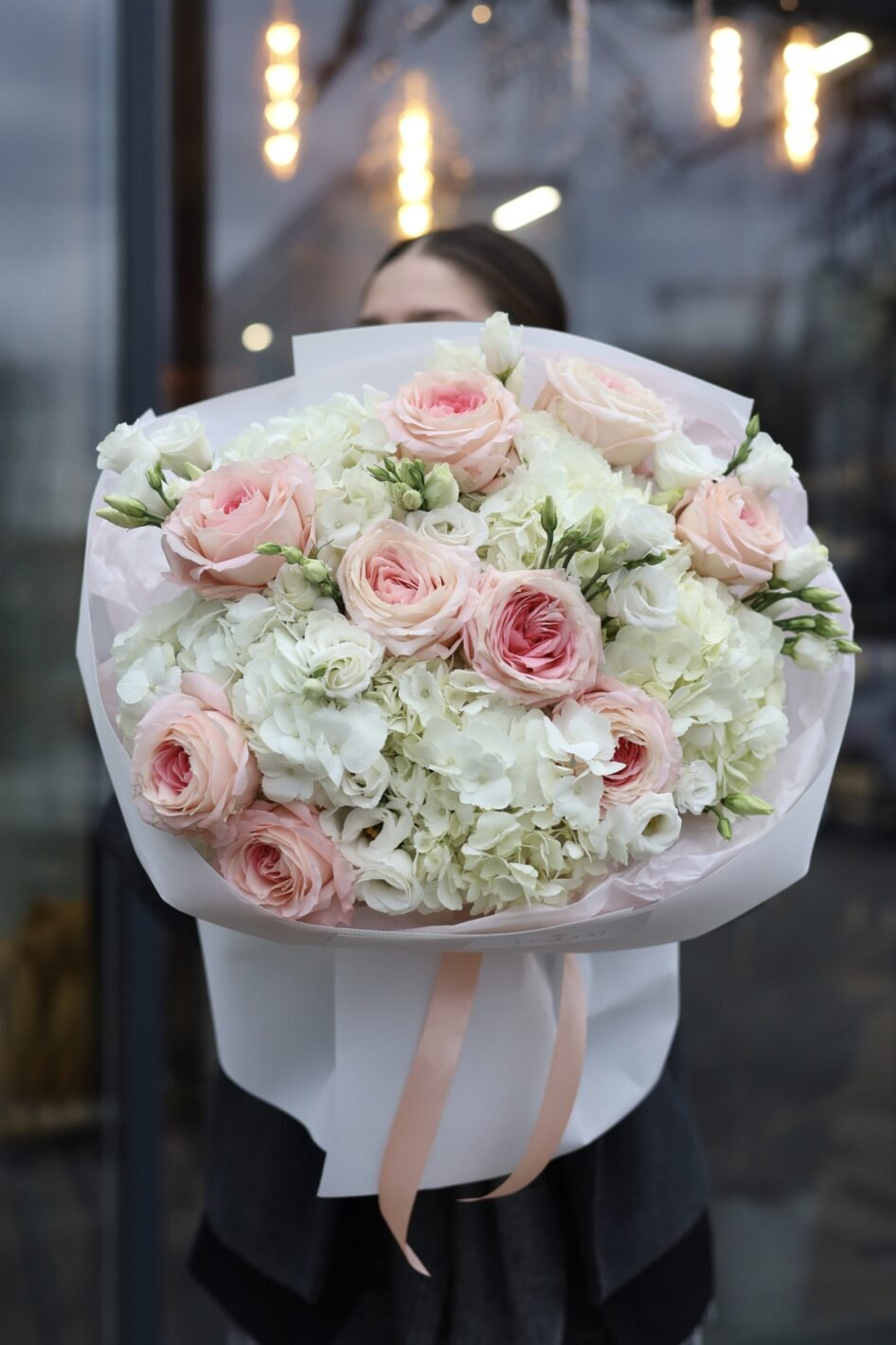 A delicate combination of white hydrangea and peony-shaped Myra roses