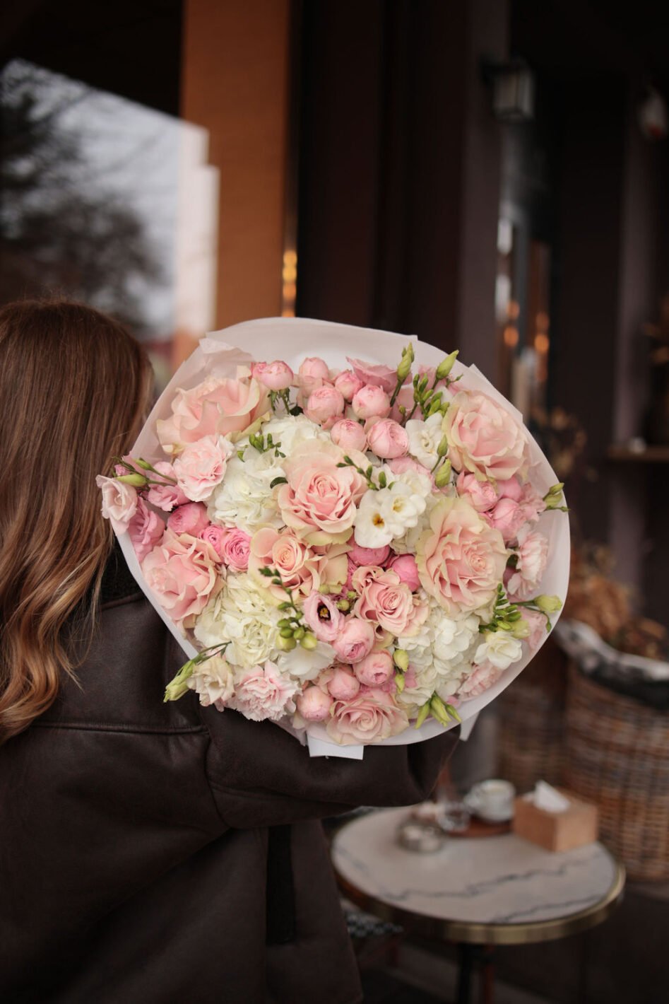 A delicate mix of white hydrangeas and pink roses