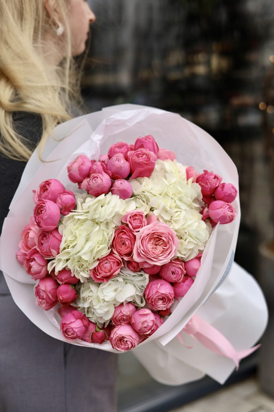 A combination of white hydrangea and peony rose Silva Pink