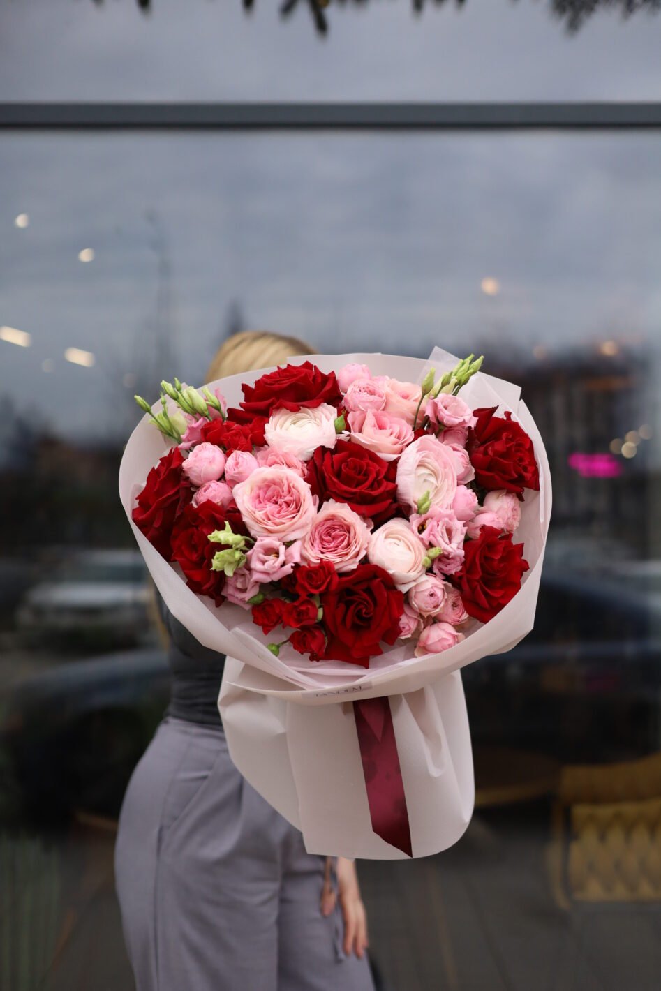 A rich pink-red mix with ranunculus and peony roses Explorer