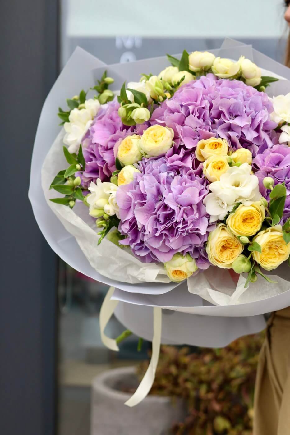 A bright mix of purple hydrangeas and peony-shaped roses, Peony Bubbles