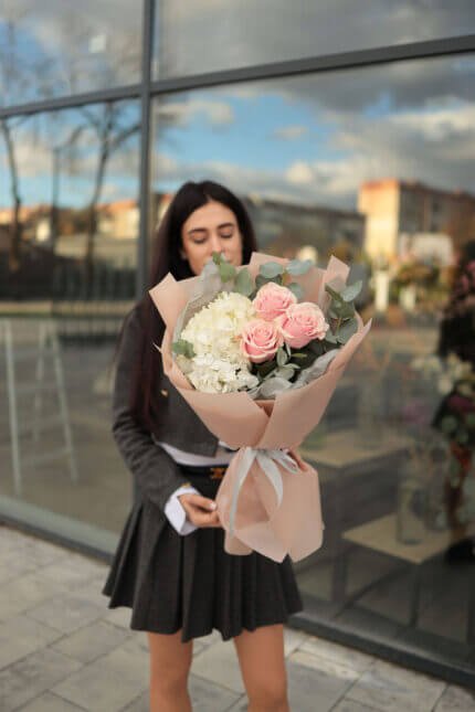 Букет з гортензією та трояндами
