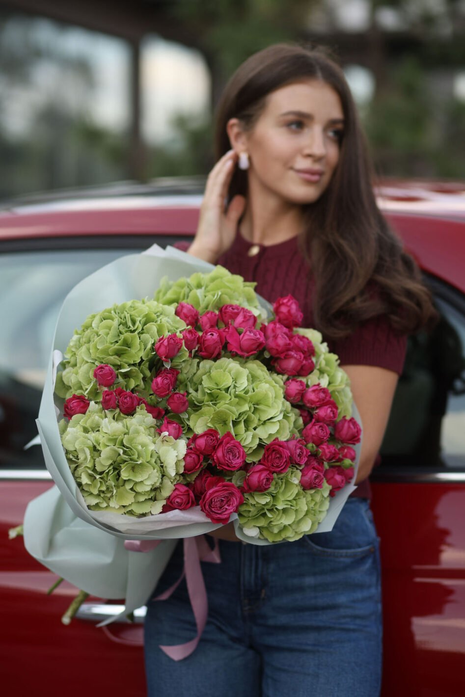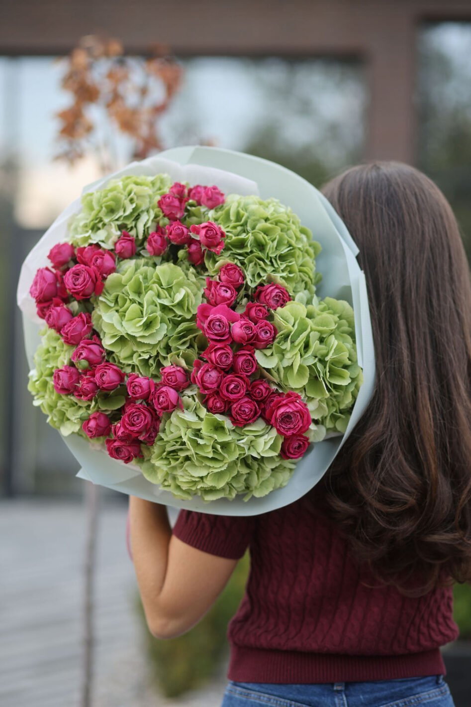 Мікс із зеленої гортензії та малинової троянди марвеловз баблз