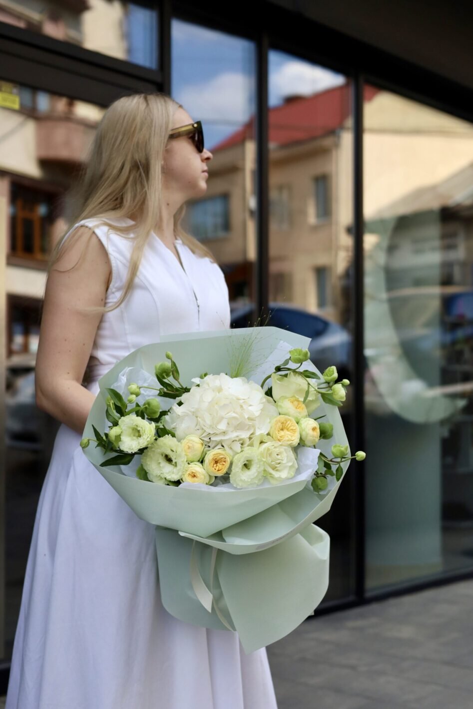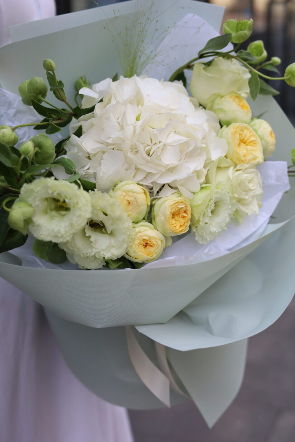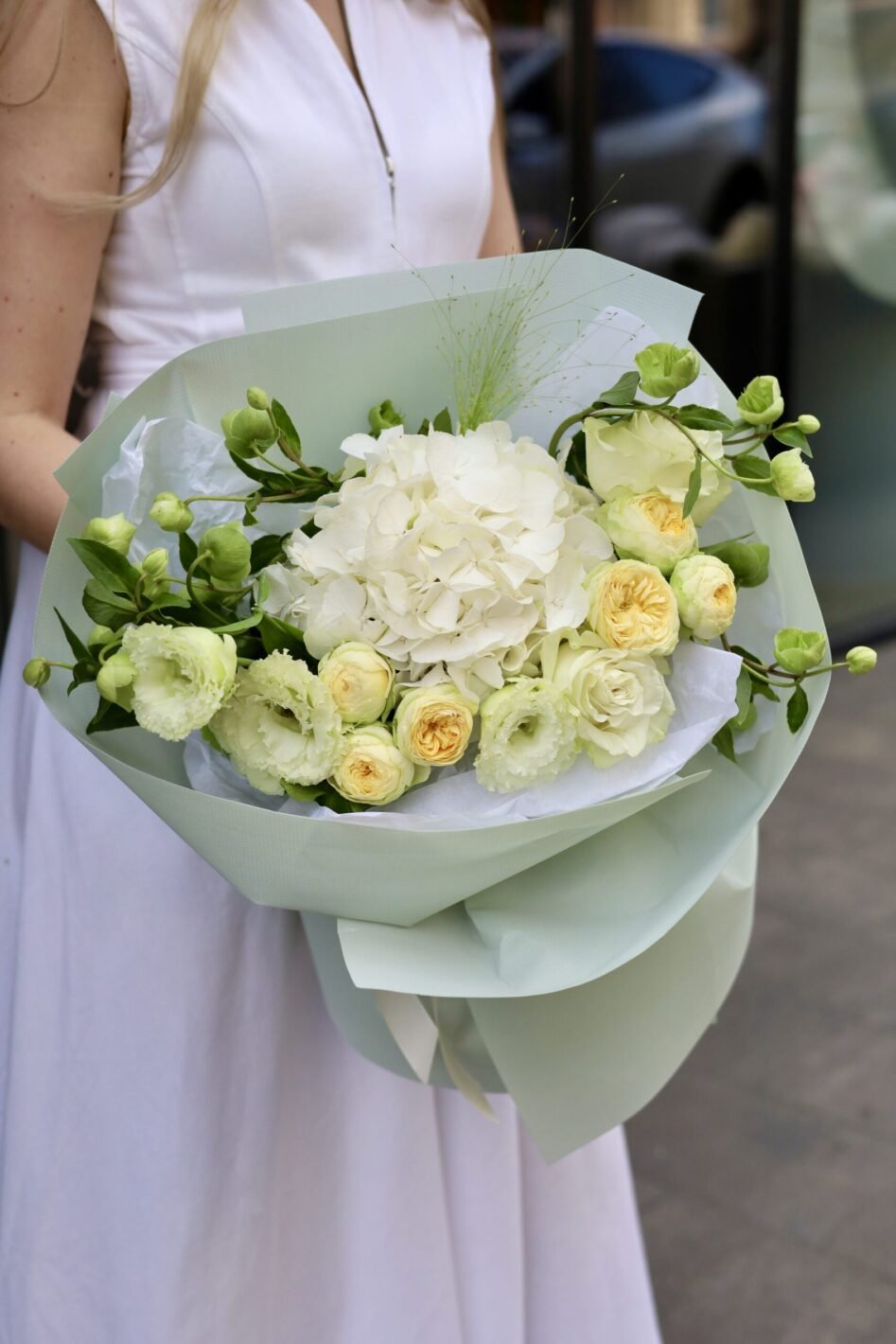 Міксований букет в освіжаючих літніх кольорах з білою гортензією та піоновидними трояндами Піоні баблз