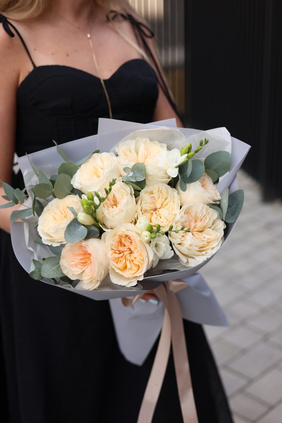 Монобукет із піоновидних троянд Аврора гарден та фрезі