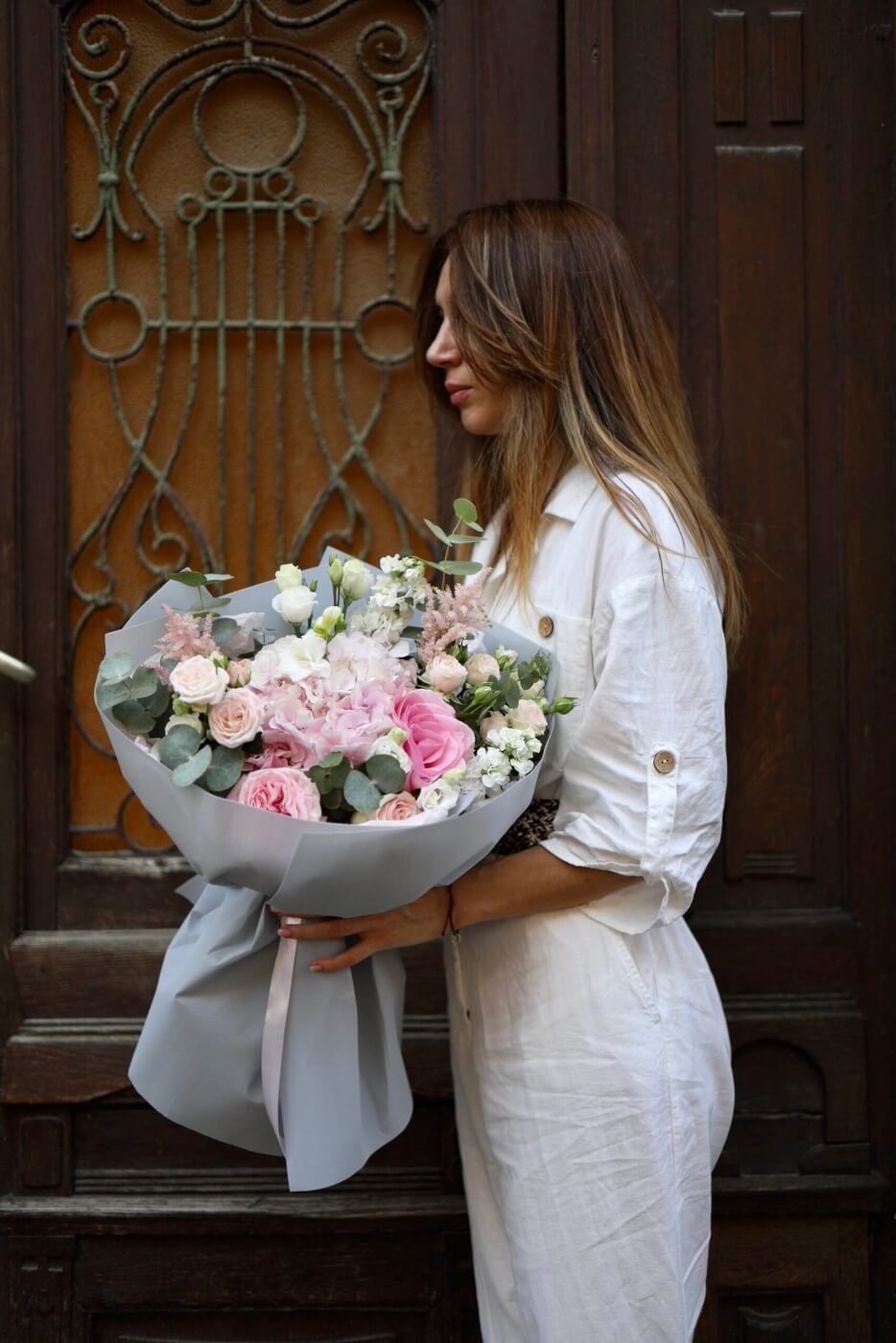 Ніжний біло-рожевий букет з гортензією, піоновидними трояндами, евкаліптом