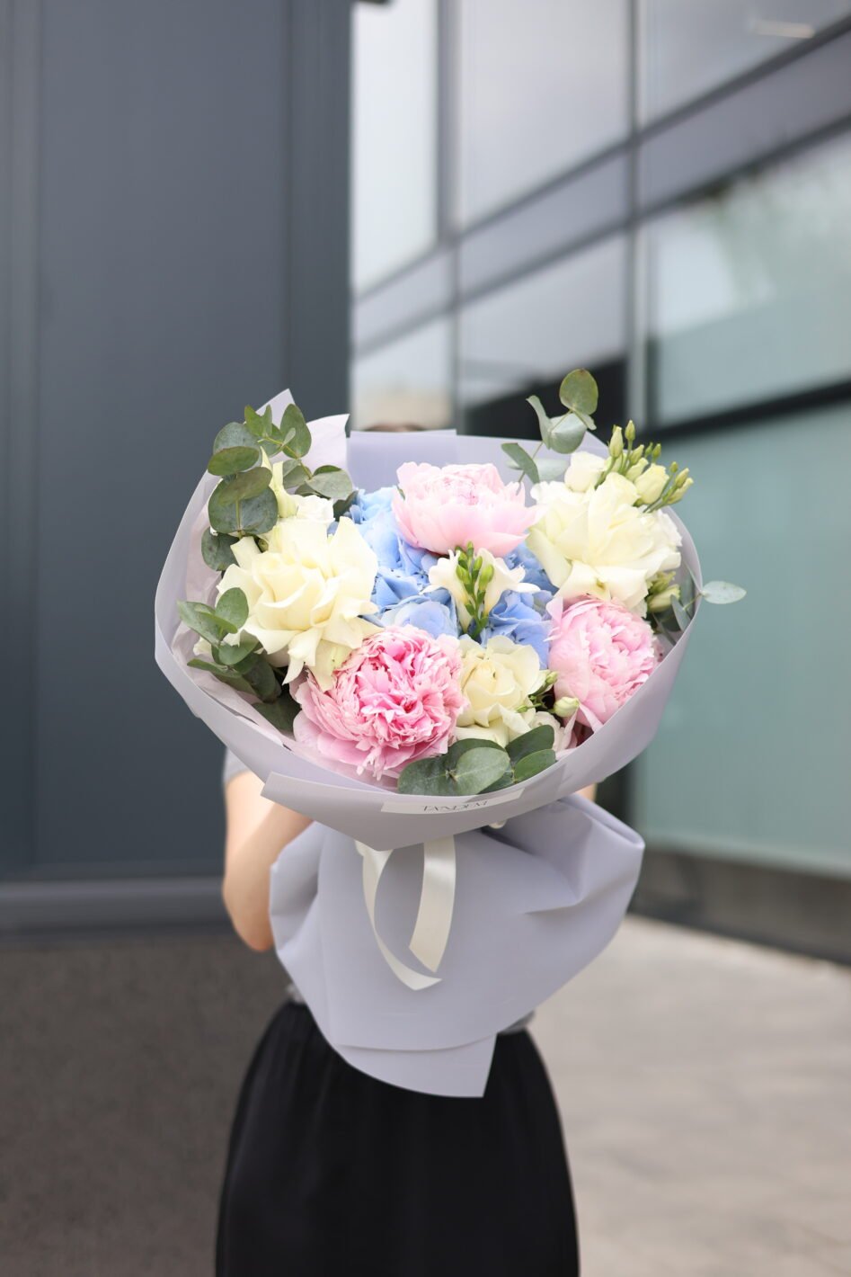 Ніжний мікс із блакитною гортензією і піонами